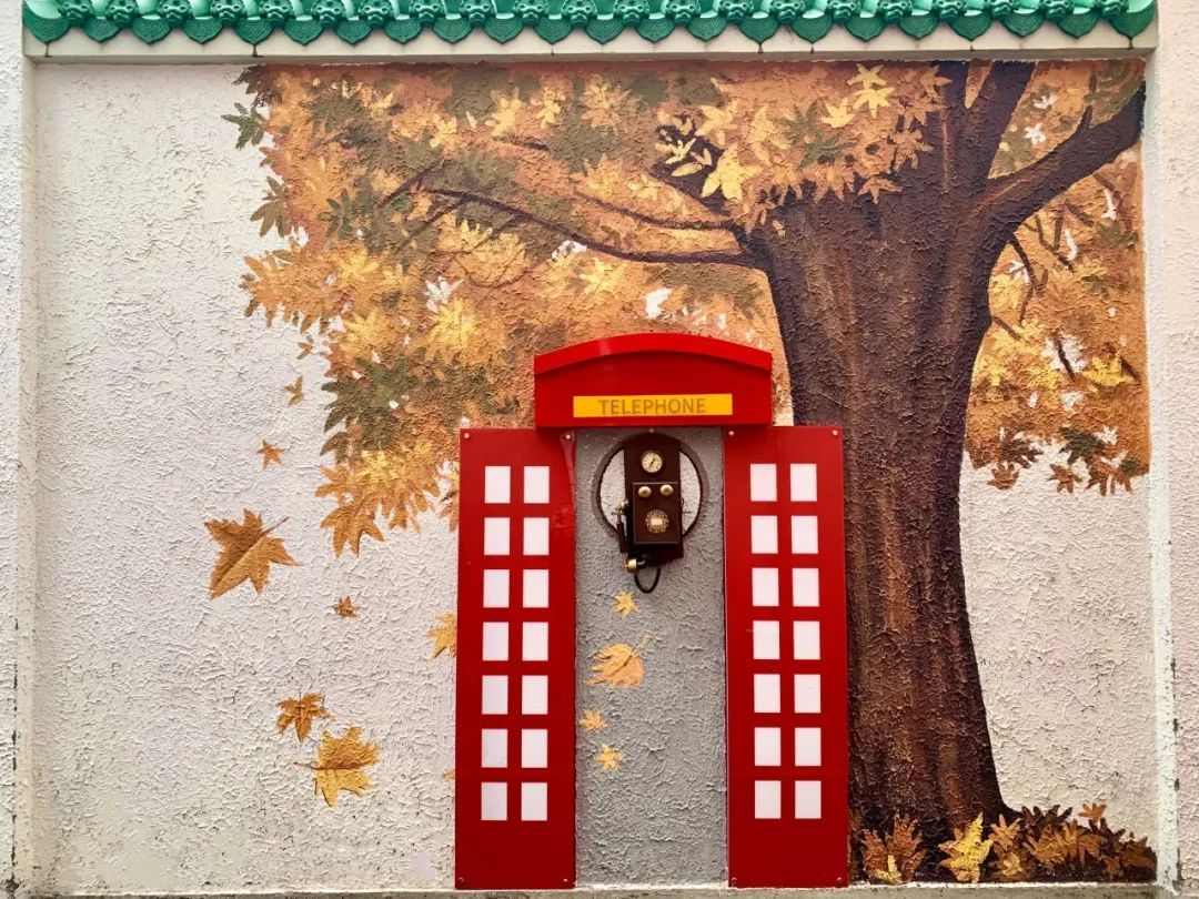 第一至第五面墙以四季为脉络,铺陈出了新华路的诗意日常。第一面墙“210弄 遇见新华”以街区地图开篇,图文并茂地呈现了新华路地标建筑与梧桐树影,引导行人探索街巷深处的文化肌理;第二面墙“新华之春”定格了绿意盎然的梧桐大道,可供市民游客休憩的法式长椅和链家支持的流动雨伞架巧妙融入画面,将艺术与便民服务相结合,传递出街区的人文关怀;第三面墙“新华之夏”透过蛋糕房的雕花窗棂,展现了一位穿长裙女孩的灵动身影,将海派建筑的历史感与市井烟火相融,生动描绘了新华路的夏日风情;第四面墙“新华之秋”以金灿灿的梧桐树和红色电话亭为焦点,营造出秋日的宁静与浪漫。墙上的电话机装置可与行人互动,拾起听筒便能触发梧桐落叶的音效,让人仿佛置身画中;第五面墙“新华之冬”则通过灯光装置打造了一个冬日网红打卡点,温暖的灯光与“光终会撒在你身上”的寄语相呼应,传递出对未来的美好期望。