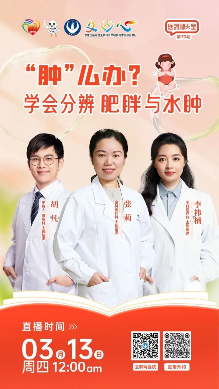 3月13日(周四)12:00,普陀区中心医院5G健康直播间将以《“肿”么办?学会分辨肥胖与水肿》为主题,由全科医疗科主任医师张莉、主治医师李祎楠、康复科主管治疗师胡凡搭档,带您一起了解肥胖与水肿的区别以及背后的健康问题。观众朋友们,让我们不见不散。