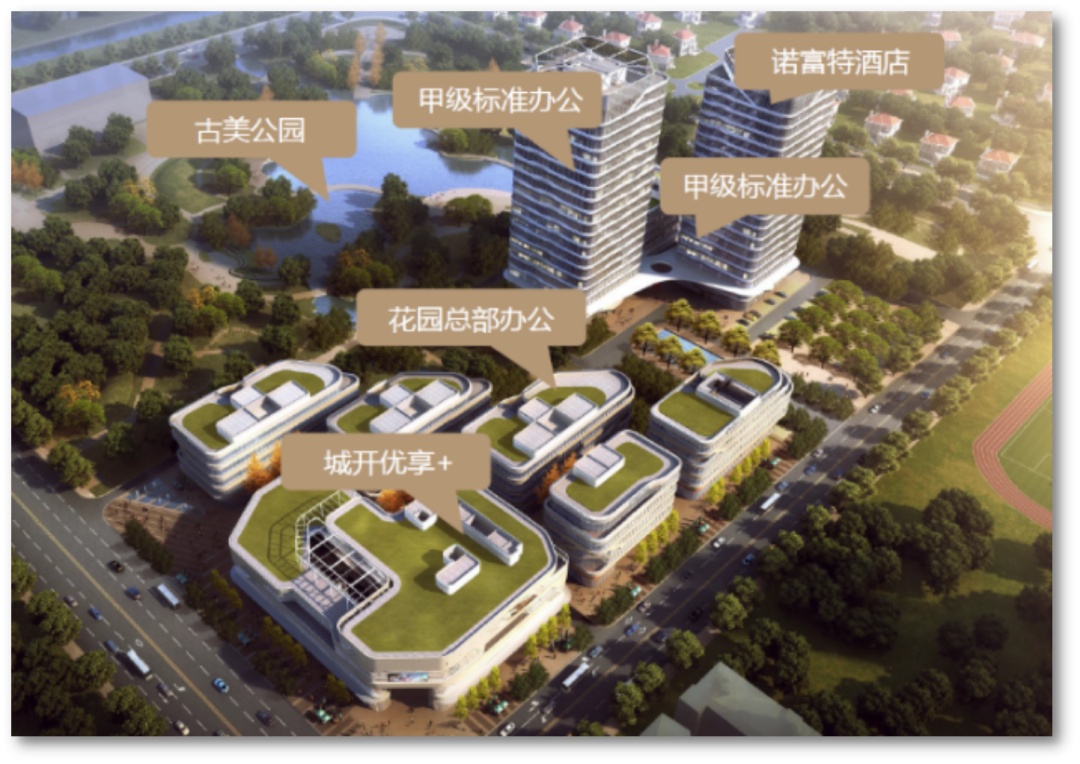 古美生态商务区汇集以万源城开中心为代表的多栋甲级办公楼宇,并在社区配套的基础上打造花园办公总部、开放式商业街区。涵盖13.6万平方米中环TOD生态综合体,两幢双子塔式的甲级写字楼,6栋约3000—6000平方米花园总部独栋办公区,配套诺富特国际酒店及约8000平方米的城开优享+商业中心,设计入围2022WAF世界建筑节大奖。