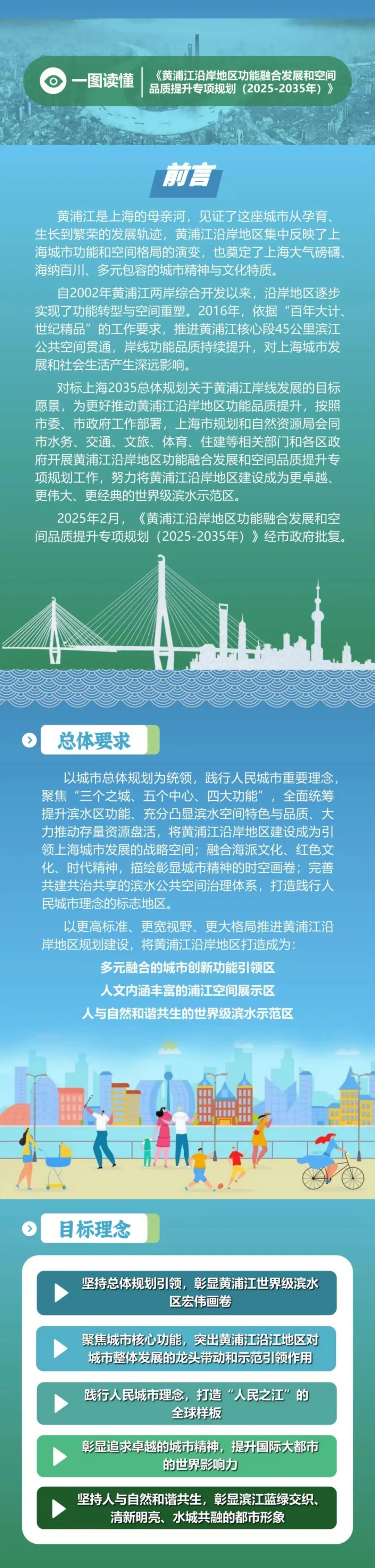 近日,《黄浦江沿岸地区功能融合发展和空间品质提升专项规划(2025-2035年)》和《苏州河沿岸地区整体风貌与开放空间提升专项规划(2025-2035)》发布。 《黄浦江沿岸地区功能融合发展和空间品质提升专项规划(2025-2035年)》将黄浦江沿岸地区打造成为多元融合的城市创新功能引领区、人文内涵丰富的浦江空间展示区、人与自然和谐共生的世界级滨水示范区。规划范围北至军工路隧道,南至银都路-芦恒路覆盖流域两岸总长约50公里,向南衔接大吴泾地区,向北衔接黄浦江中北段地区和大吴淞地区,涉及杨浦、虹口、黄浦、徐汇、闵行、浦东6个区,形成沪派秀场、艺文智岸、文博创链、世界客厅、新质秀岸等五大分段布局。 《苏州河沿岸地区整体风貌与开放空间提升专项规划(2025-2035)》规划将苏州河沿岸地区打造成为:具有典型上海人文风情特点、苏河风光特征、历史风貌特色的苏河映象展示带、都市风情集聚区、世界级滨水示范地,设计形成“一脉、八廊、五段”总体布局,五段分为都市经典段(河口-昌平路桥)、时尚创意段(昌平路桥-曹杨路桥)、校园风情段(曹杨路桥-真北路桥)、新绿宜居段(真北路桥-外环吴淞江桥)、生态创新段(外环吴淞江桥-嘉松北路吴淞江桥)等五个特色主题区段。详见↓