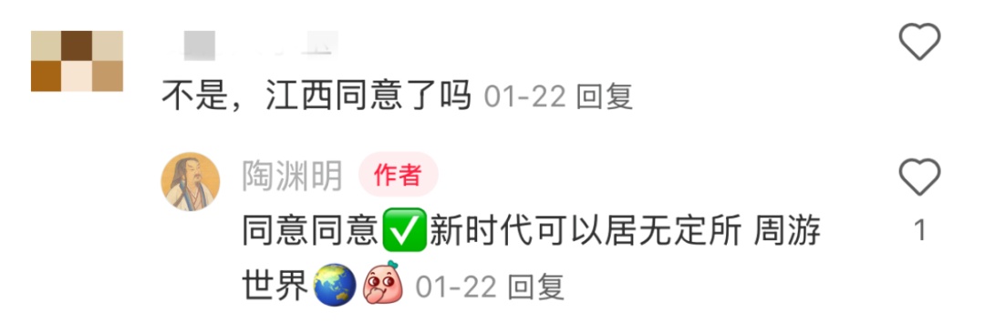也就在同一天,陶渊明也来了。都知道陶渊明是江西人,于是有人在评论区留言“不是,江西同意了吗?”博主的回答也很有意思,“同意同意。新时代可以居无定所,周游世界。”
