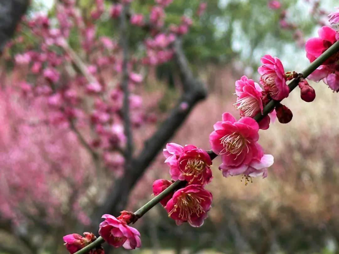 极目远眺,远处的红梅犹如胭脂洇染,一簇簇、一丛丛,开得灼灼耀眼,与绿梅相互映衬,相得益彰。