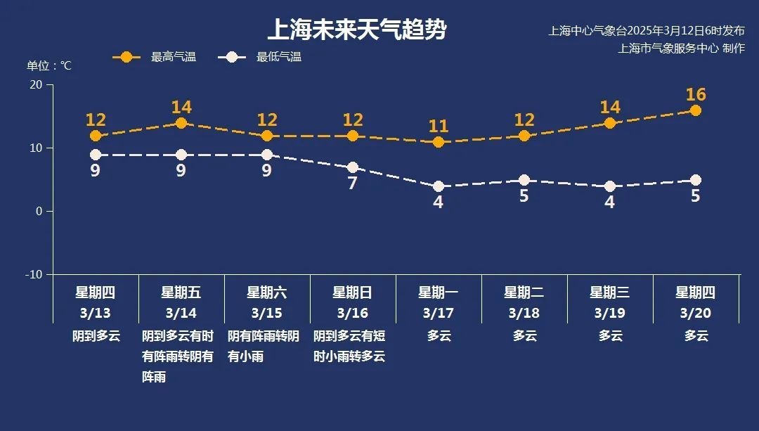 3月13日(周四):阴到多云转阴到多云有短时小雨,9~12℃