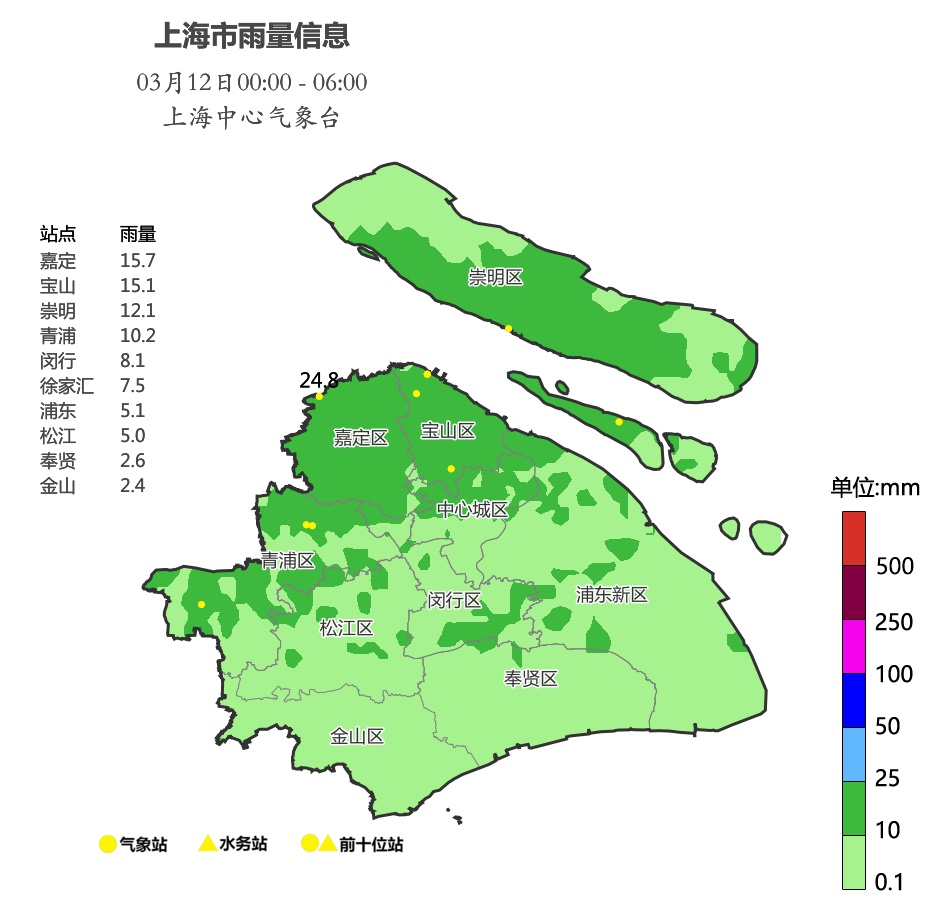 昨天夜里到今天(3月12日)早晨本市出现降水过程,部分地区出现大雾天气,出行请注意交通安全。今天白天依然是阴有时有阵雨或雷雨的天气,局部地区雨量中等,中午以前沿江沿海地区有雾。白天最高气温在15℃左右,东北风3~4级,中午起沿江沿海地区4~5级,相对湿度95%~60%。