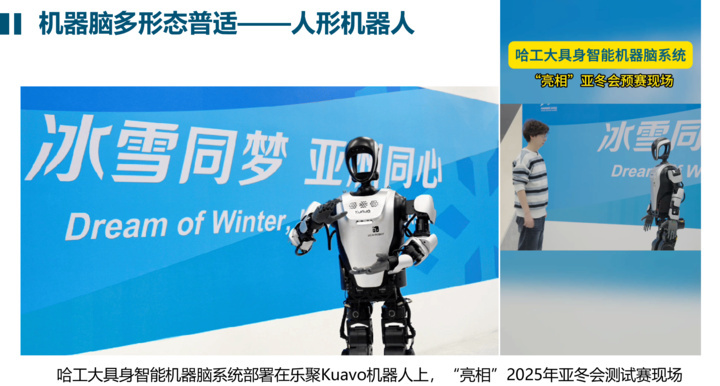 人形机器人、轮臂机器人等多种形态的机器人,都能安装这款“大脑”。此前,在亚冬会测试赛场馆提供服务的乐聚公司“夸父”机器人,就搭载了这款“大脑”。去年开始,在哈尔滨市中央大街哈工大中心上岗的展厅机器人“小红”,也用这款“大脑”进行“思考”。