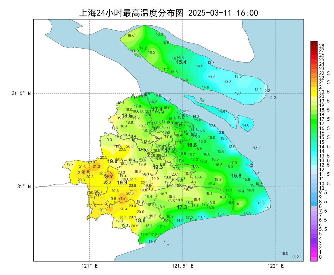 申城今天白天以多云到阴的天气为主,中午起云层逐渐打开,大家期盼的太阳终于上线,气温攀升。气温分布西高东低,郊区中松江站最高,气温一度达19.9度,市区徐家汇站最高气温为17.2度。