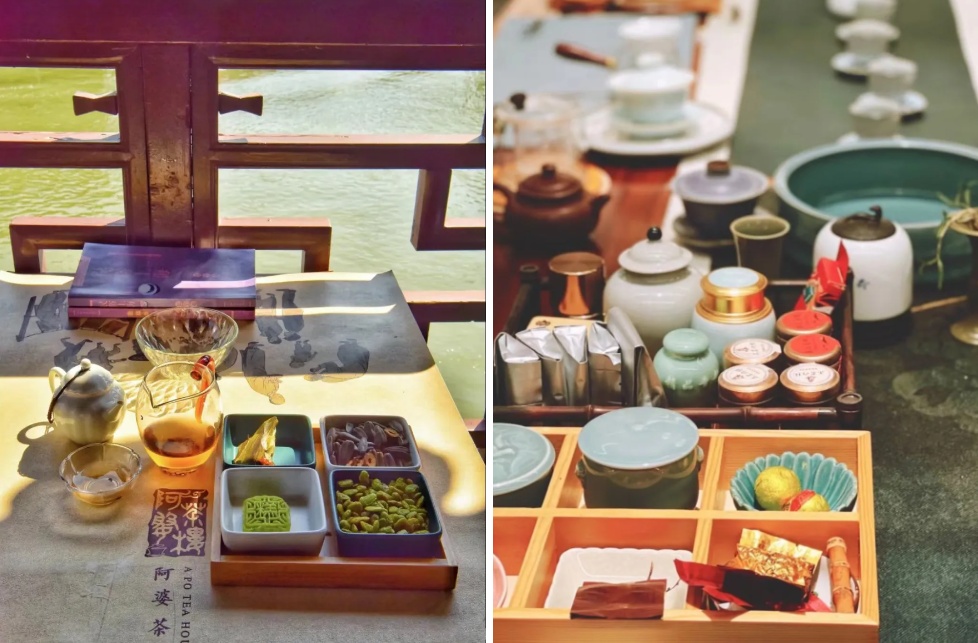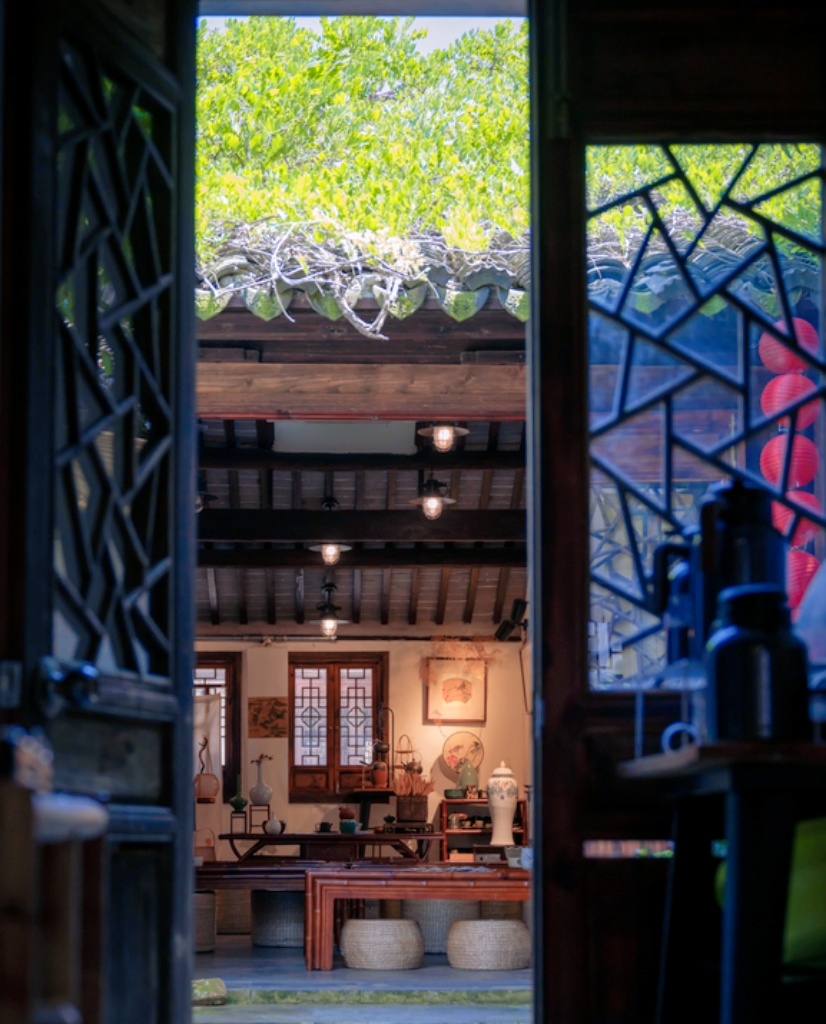 这里汇聚了中国传统文化的诸多美好元素,有茶艺、轻食、文玩、器物、手作等。踏入大门,穿过葳蕤庭院,时间仿佛也放缓了脚步,变得温柔绵长起来。当你游览古镇时,可以来此稍作小憩,这里临街傍河,与三五好友一起品茶,享受温暖阳光与庭院美景。