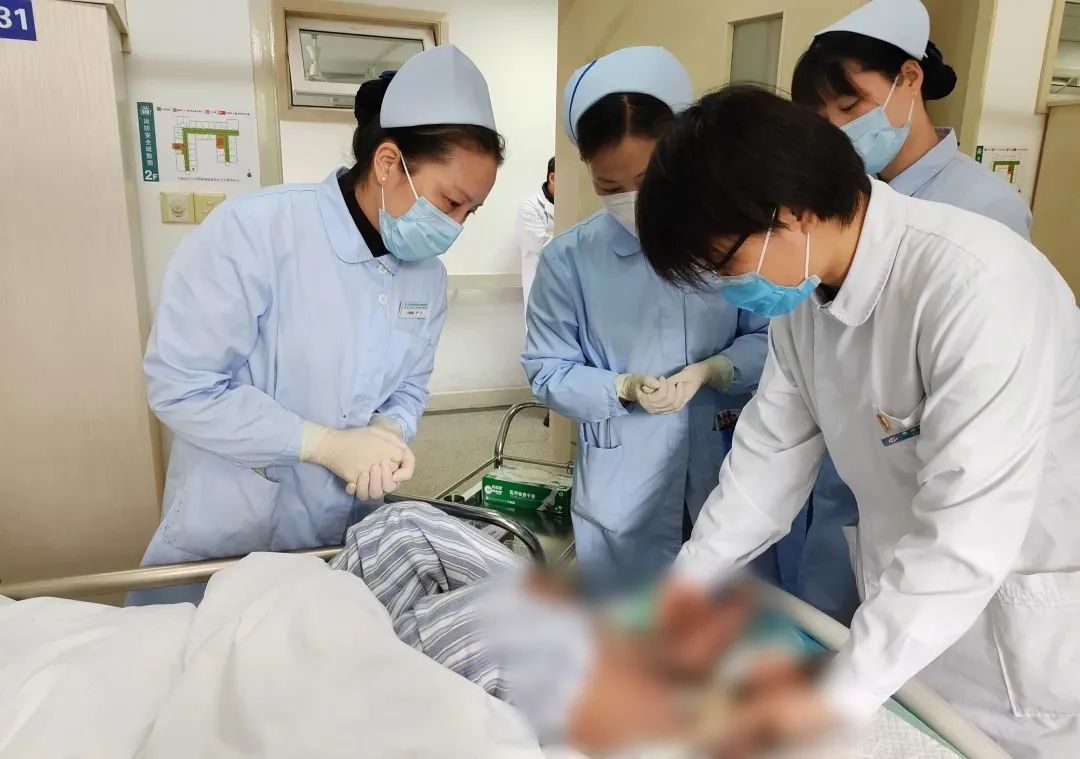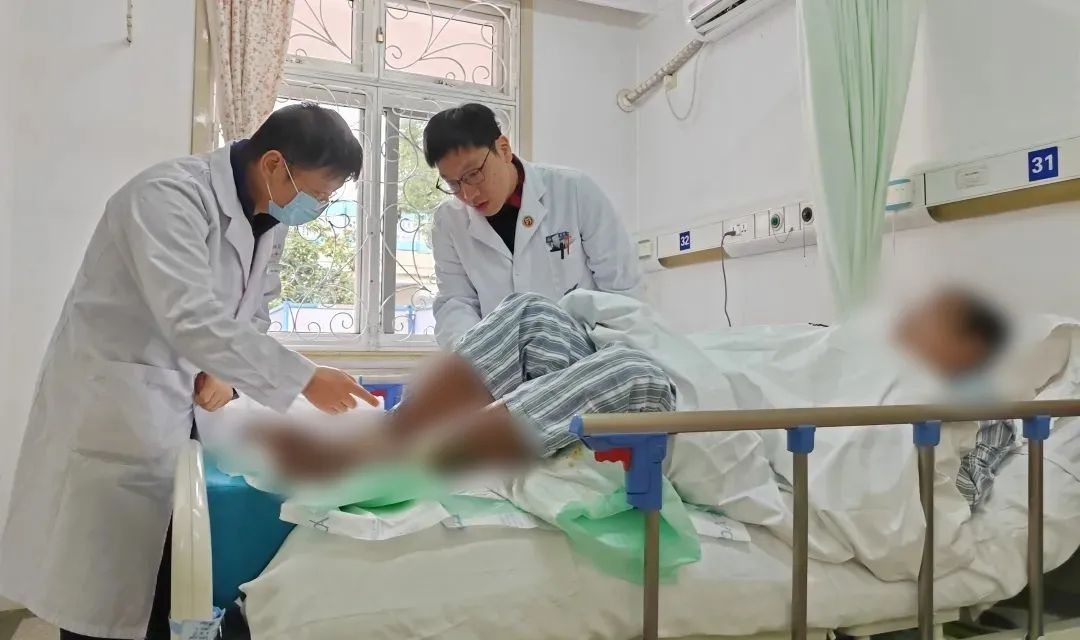 “我们建议可以涂一点尿素霜,防止患者皮肤的干燥,减少抓挠现象。这些黑痂部分会慢慢愈合的,但在渗出期会有大量的液体渗出,病人活动时皮肤很容易开裂,可以采用湿性敷料。”陈茹轻轻查看着王先生足部、腿部伤口,还时不时和病房护士交流着护理经验。另一侧,叶博闻医生和程家桥街道社区卫生服务中心康复科主任洪皙炜也在交流着王先生的病情。“现在心衰控制住了,血糖也保持稳定,等皮肤慢慢长好一点, 就可以进行下一步的治疗了。”提到王先生的现状,洪皙炜满是欣慰。