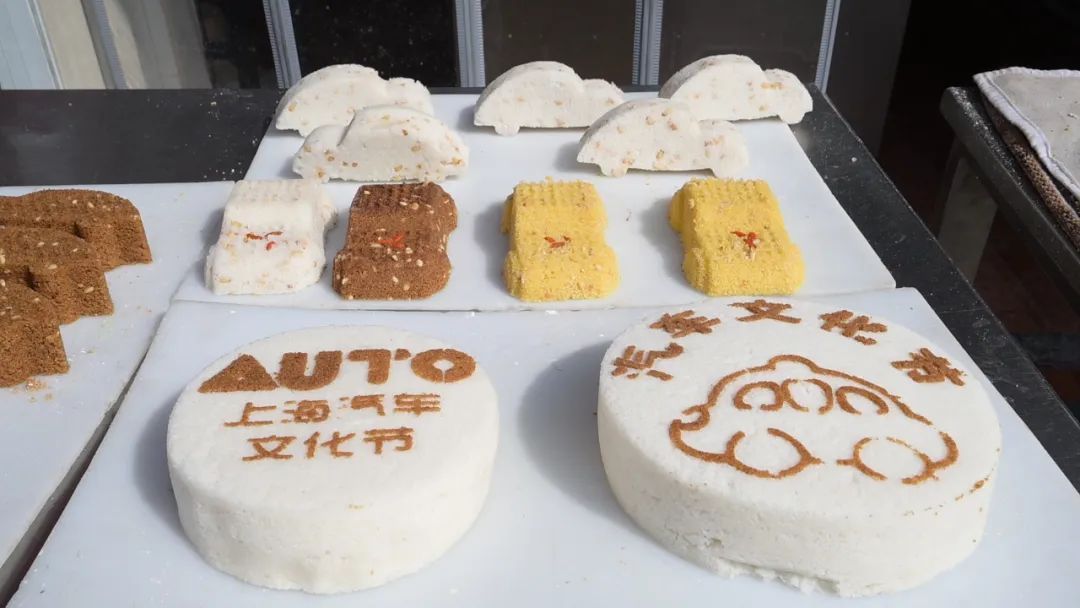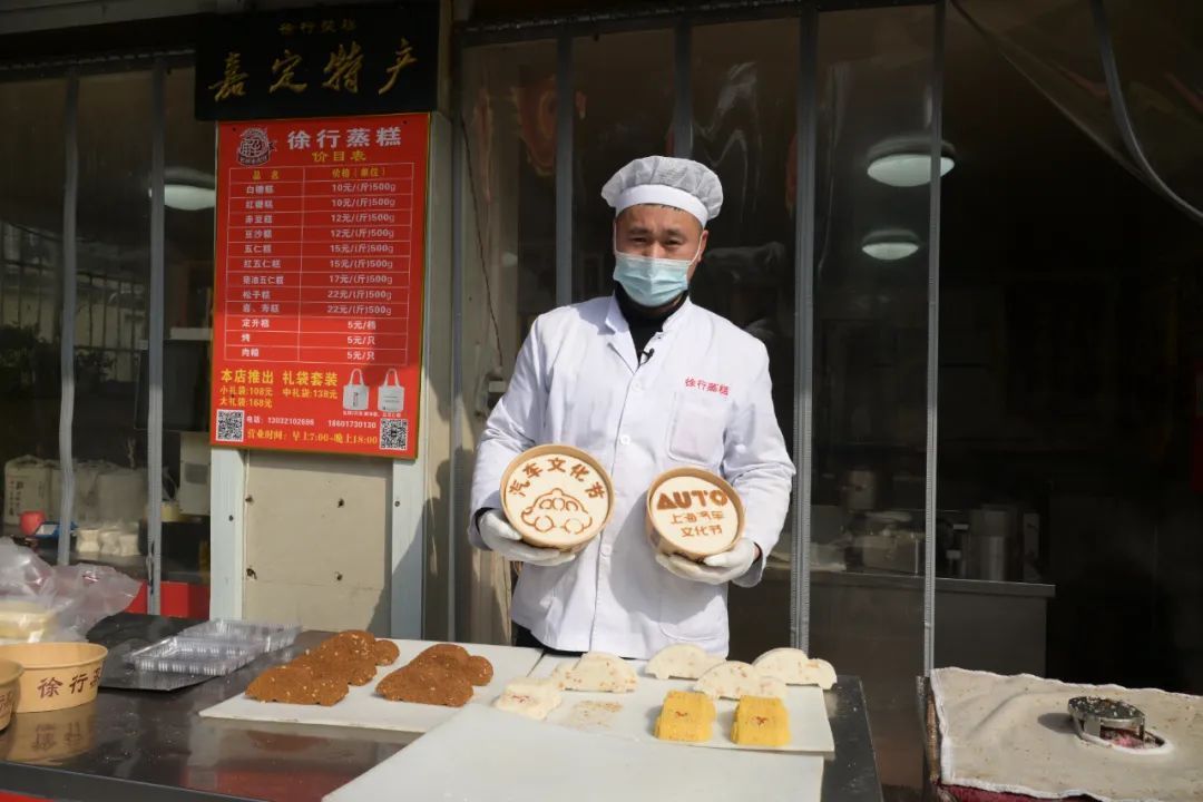 蒸汽翻涌的蒸笼前,徐行蒸糕非遗传承人解荣光正将一块印着“上海汽车文化节”字样的蒸糕轻扣在案板上,赛车轮廓在氤氲热气中逐渐清晰。