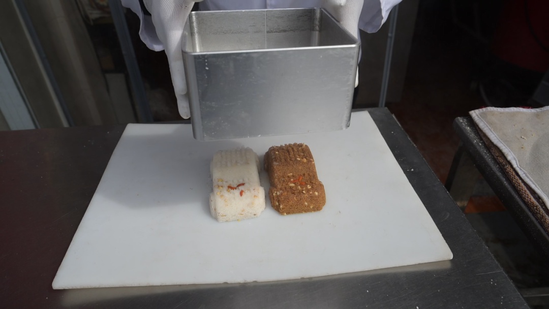 除了传统的圆形造型蒸糕,还有赛车造型的蒸糕,尤为亮眼。这款模具花费了解荣光团队不少工夫,“我们联系了多家3D打印公司,由于设计师不了解蒸糕米粉的特性,一开始效果始终不理想,经过反复调整才确认了这款汽车造型模具。”解荣光坦言。