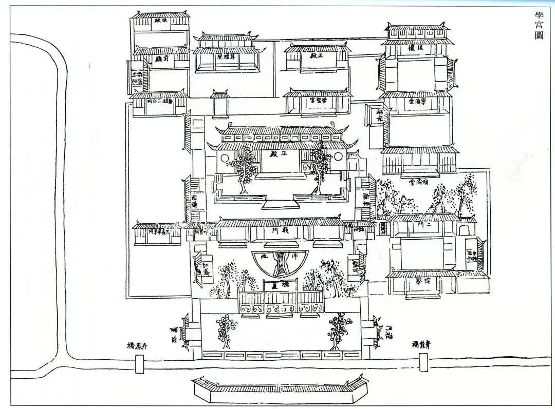据清光绪《崇明县志·学宫图》记载,彼时,学宫前有东西牌坊、万仞宫墙、文昌宫和魁星阁;中间为孔庙建筑,共五重,自南至北依次有棂星门、登云桥、泮池、东西官厅、戟门、名宦祠、乡贤祠、大成殿、东西两庑、尊经阁和崇圣宫及正殿;东为儒学,共五重,自南至北依次有儒学大门、二门、书斗公所、明伦堂、学海堂、后楼和东西两厢;西为书院,共四重,自南至北依次有忠义孝悌祠、唐赵二公祠、沈忠节公祠和原书院前厅、后殿,规制完备,礼乐齐全,凸现中和。