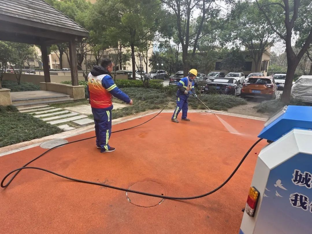 20余名环卫工人组成的专业队伍成为“环境美容师”,他们手持绿化修剪钳、高压水枪等工具,对小区主干道、绿化带、宣传栏等卫生死角进行深度清洁。高压水枪喷射出的水流精准冲刷地砖缝隙,修剪钳则让杂乱的绿篱重新焕发整齐生机。