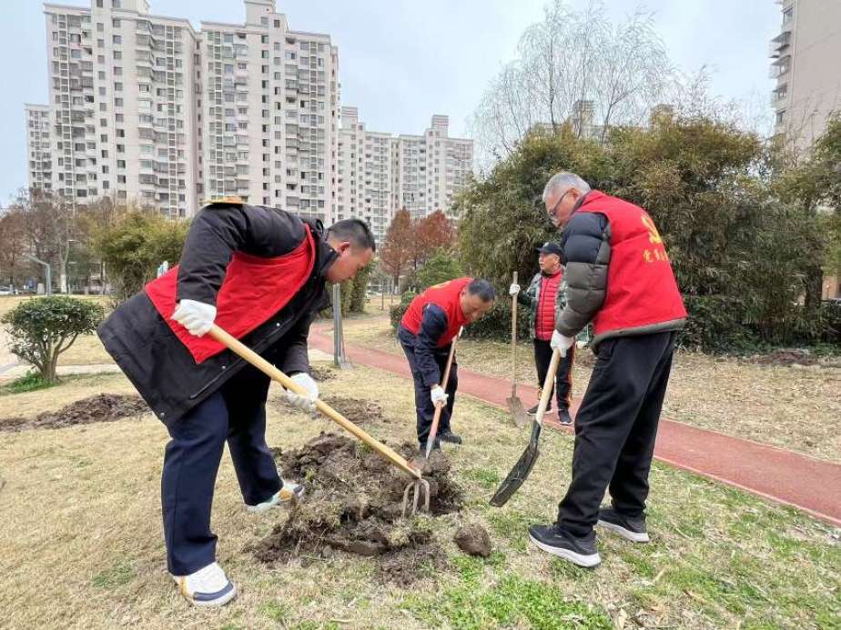 在金群苑居民小区植树现场,参加义务植树的790路公交驾驶员、党员职工及社区志愿者们,手持铁锹、铲子等工具,干劲十足。在居委工作人员的带领下,大家分工明确,挖坑、搬运树苗、种植、浇水……每一道工序都一丝不苟,在春风中共同传递着生命的美好。