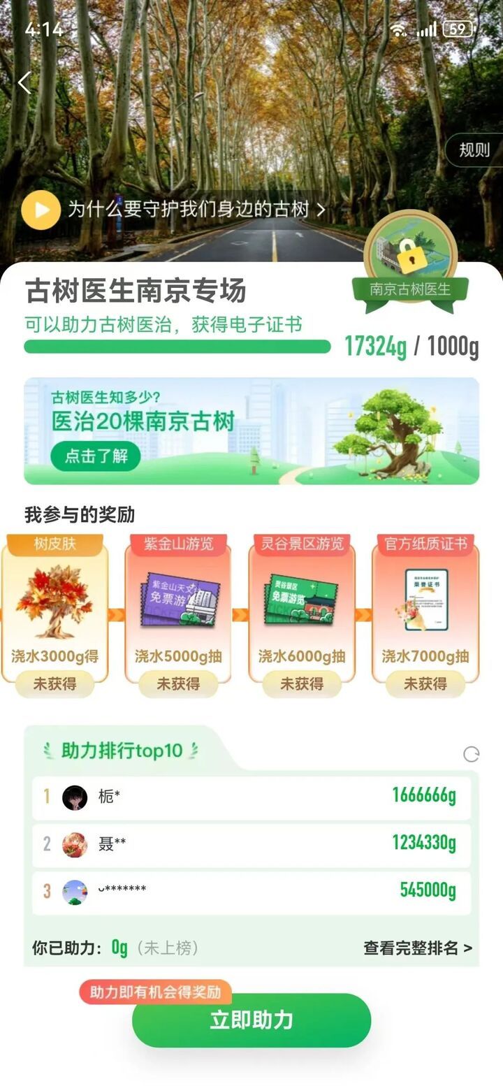 南京市绿化园林局与支付宝蚂蚁森林开展“古树医生南京专场”活动,市民可以通过绿色出行、在线办事等低碳生活方式获取的“绿色能量”来申请保护古树,助力古树健康生长。