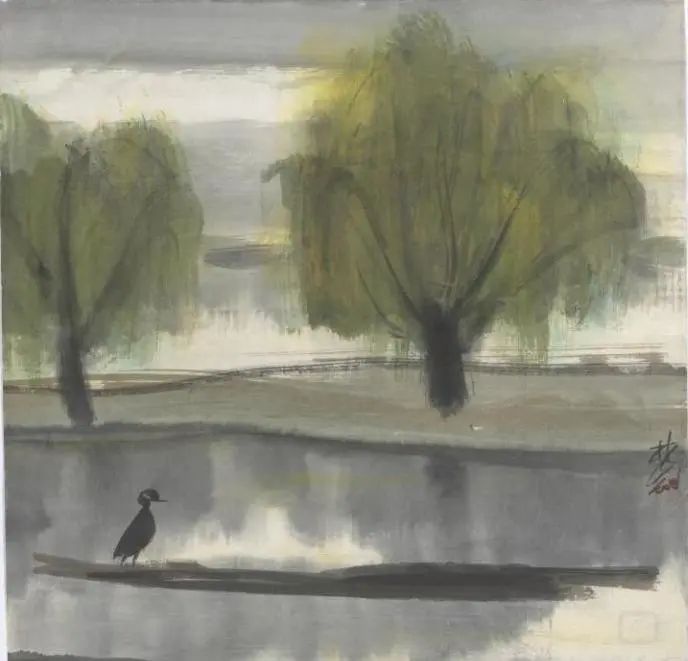 这幅画描绘了夕阳之下,湖水宁静,水鸟独立浅渚,湖岸绿柳如烟的景象,画面右下脚有林风眠的落款,钤印为“风”。这幅画看似呈现了中国古典审美意境的画面,实际上采用了不少新的表现方式,林风眠用中国传统水墨的写意性去融合西方写实艺术的样式,物象明确但不作细致描摹;色彩方面更是大胆尝试墨与色的融合,广告色(特别是黄色)的运用明显增加。他的西画修养,使他能够运用中国画的材料自如地处理画面的逆光、倒影、色调、空间感与空气质感等,使这幅画既保持了水墨的透明性,同时又体现出源于自然的色彩记忆。