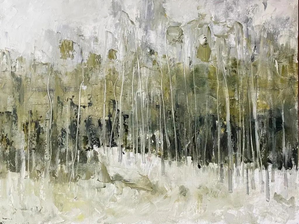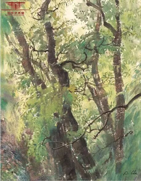 这是哈定先生在美国住处附近的公园的小品。这幅作品哈定先生截取视觉中的树林一角,着重刻画一截枝干。扭曲的枝干,伸展的枝桠,蓬勃的生命力扑面而来。大笔触虚点出树林深处的郁郁葱葱,虚实结合,将郁郁葱葱的丛林风光表现得淋漓尽致。