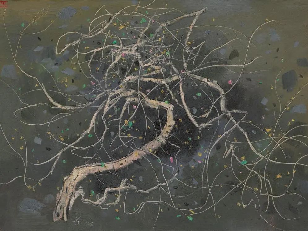 作品描绘了一棵树,枝干、藤条繁密,曲折并缠绕,色点点染表现树叶。作者以点、线的形式表现了一棵树的春意,用作者的话就是“点线迎春”。画面中的线条流畅,似有流动的感觉,充分展现出线条的艺术表现力。点与线的结合密切,相互映衬,书写出一首春意盎然、浪漫抒情的春之歌。
