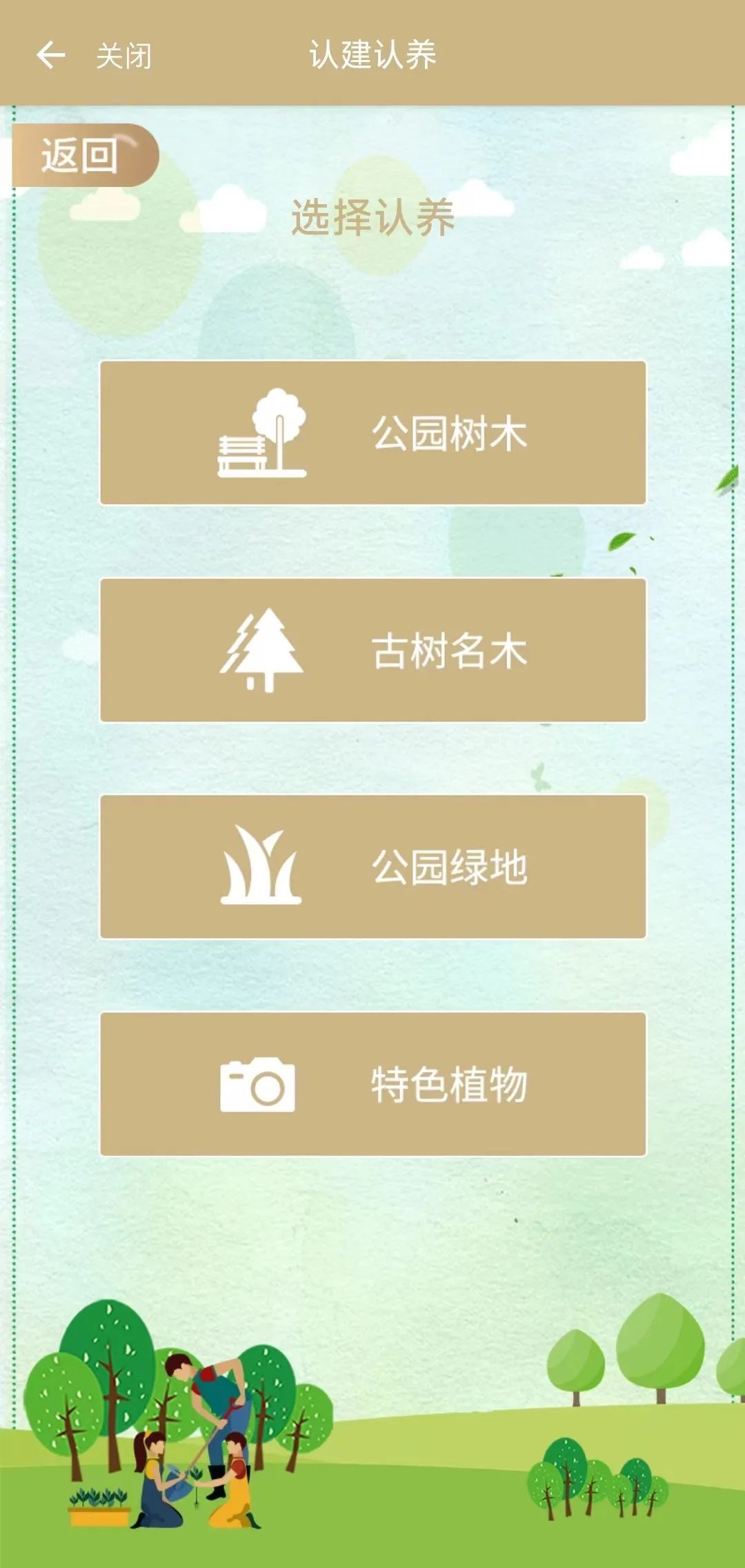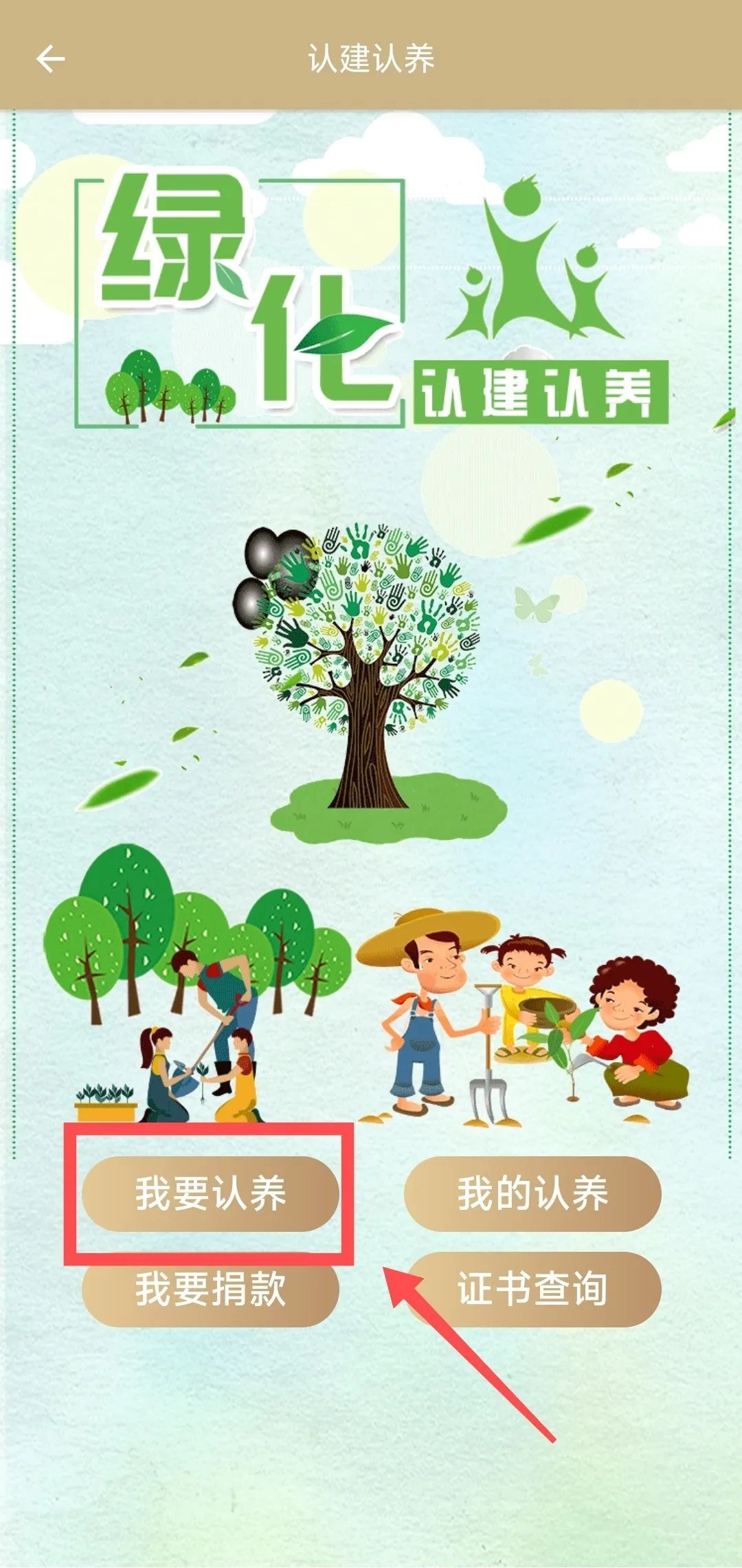 点击【我要认养】进入,可以在公园树木、古树名木、公园绿地、特色植物中选择认养。