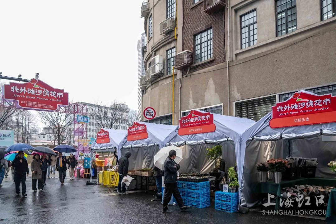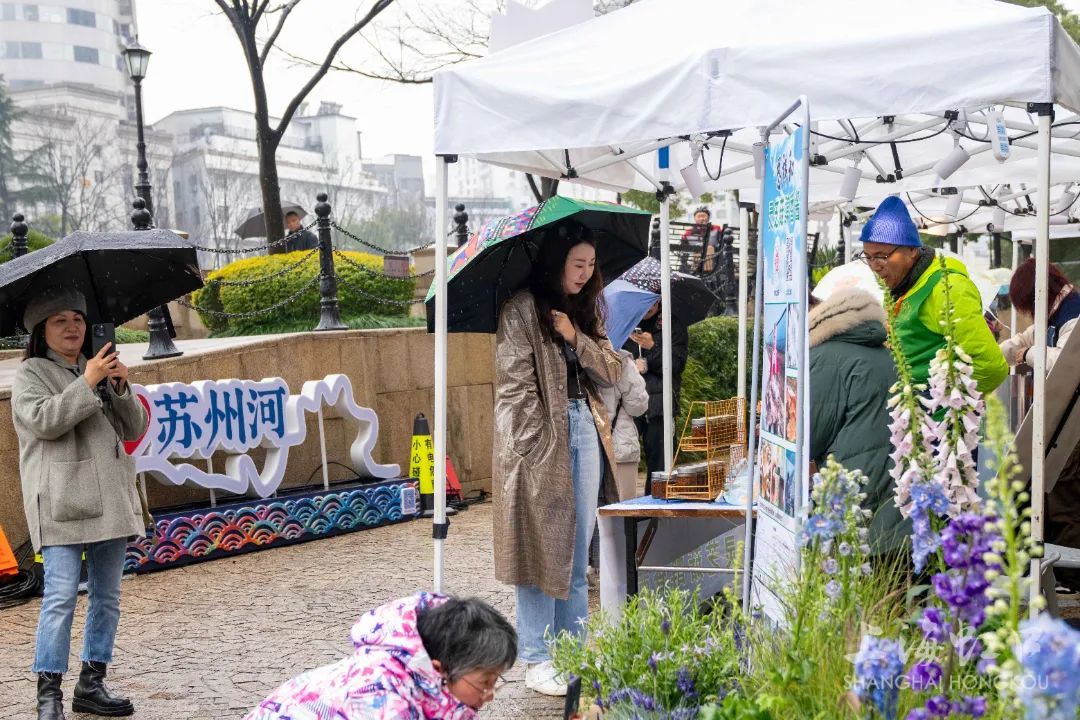 细雨蒙蒙中,江风吹拂、花香四溢。在江西北路至北苏州路部分路段,以“低碳、绿色、生活”为主题的北外滩河缤花市开街,设置了30家国内外特色摊位,涵盖花卉绿植、有机轻食、非遗手作、国际美妆等多元业态,吸引不少市民群众驻足。