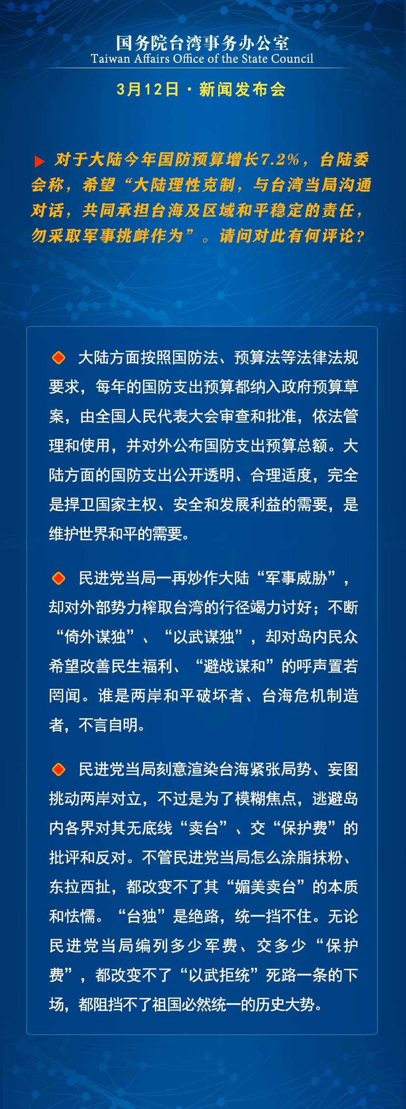 国台办:民进党当局编列多少军费都改变不了“以武拒统”死路一条的下场