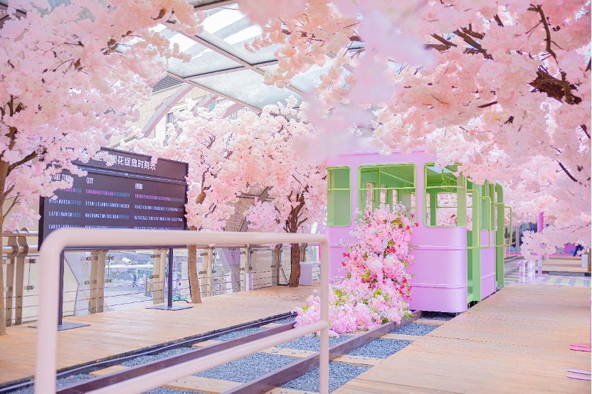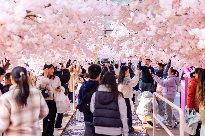 今年,宝山天街创新升级樱花主题场景,首次打造50米沉浸式樱花隧道,隧道中设置春日列车、春日电话亭、樱花长椅、全球樱花绽放时刻表等多个网红打卡点。周末,樱花隧道下起限时樱花雨,营造落英缤纷的浪漫氛围;夜晚,樱花景观与隧道上的光影灯带交相辉映,吸引市民驻足观赏。此外,商场特别推出打卡领周边活动,打卡樱花隧道3个及以上点位即可领取樱花限定礼品,首周末即带动客流突破10万人次,创下春季客流新高。