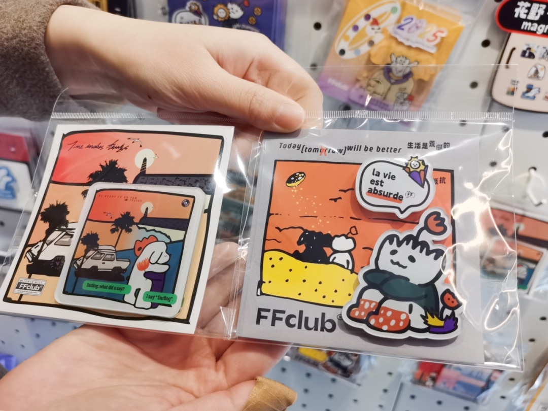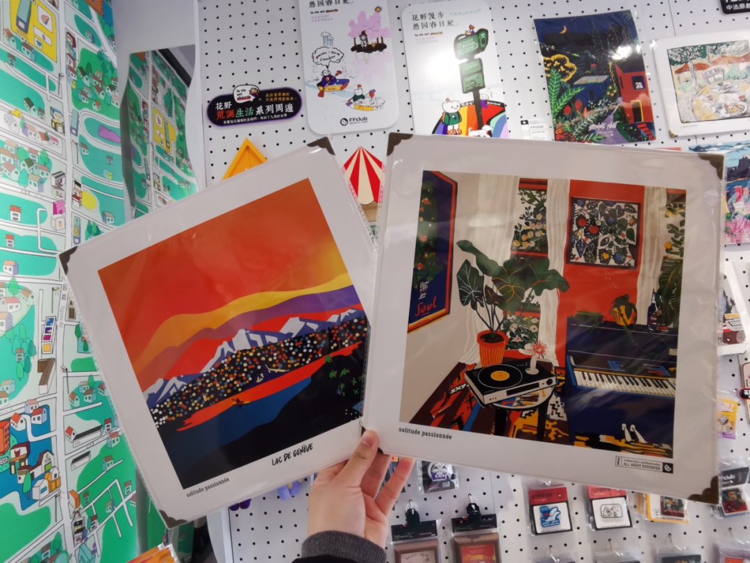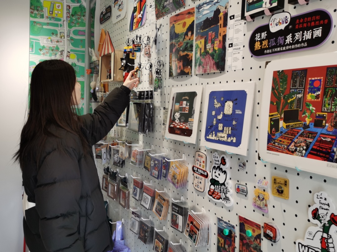 走进故事商店,首先映入眼帘的便是“FFclub花野俱乐部”专区。作为文创插画品牌,“FFclub花野俱乐部”在5年里,原创设计了“热烈孤独”“荒诞生活”等系列插画和文创周边。
