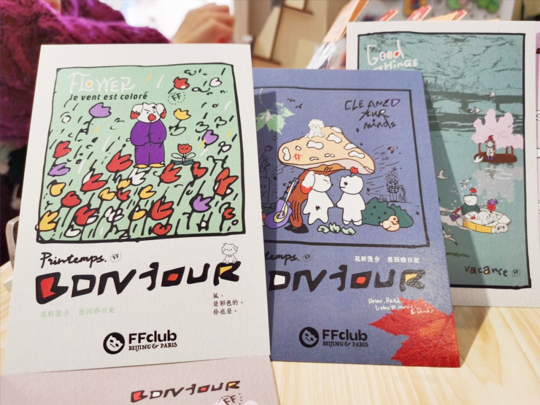 此外,花野还全新设计了一套明信片,以“从塞纳河到愚园路”为主题,融入巴黎、上海两座城市共有的梧桐元素。“我曾在巴黎待过2年,趁着工作和学习的间隙漫步城市街头,让我获得了许多创作灵感,也想通过这套明信片把那份惬意和治愈带给大家。”她说道。