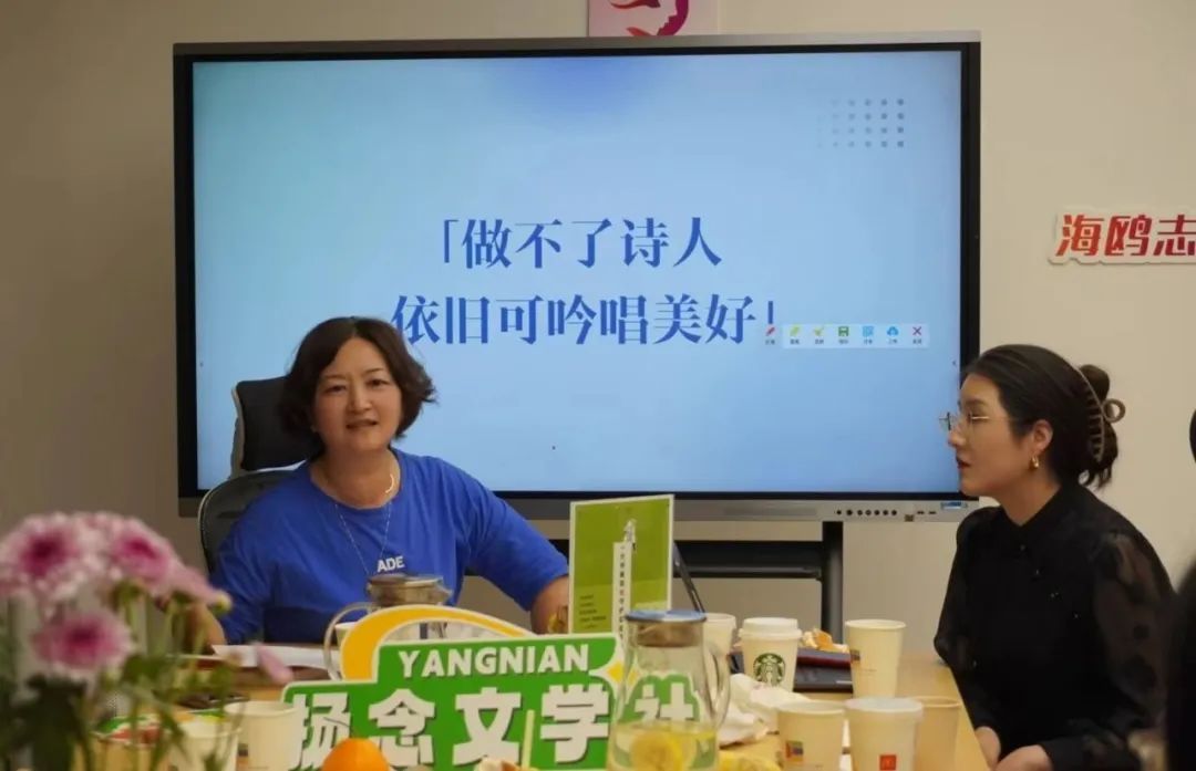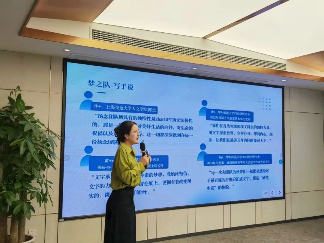 “海鸥计划”的一个关键词是“对话”:优秀毕业生和学妹的对话,女企业家、职业女性与女大学生的对话,女大学生与自己的对话……在一次次倾听和诉说中,一个个独一无二的“她”凸显出来,在走出象牙塔,来到人生的十字路口之际,找到未来的方向,树立人生的坐标。在扬念,成员们不仅在写作上进行交流,更会看到自己,拥抱未来。当她们或迷茫或焦虑时,扬念成为了她们可以停靠的温暖港湾,人生中的重要一站。学妹小A是华师大法语专业,在参与线下采风拍摄、活动策划、新媒体运营的过程中,原本计划出国留学的她有了新动力,她发现自己对新闻媒体专业很感兴趣并且愿意把这作为一份职业,最终她成功保研至中国传媒大学,开启新的学习之路。经小A推荐,她的同系好朋友小B也成为了扬念的成员。“每一次和团队的伙伴们一起把灵感经过千锤百炼的打磨后汇成文字,都是妙笔生花的体验。”当自己的文字被看见、被认可后,小B很有价值感,也坚定了自己要走文学创作的道路。最终她以笔试第一名的成绩跨考至华东师大创意写作专业,通过学校举办的多个对谈活动,和莫言、余华、孙甘露等大家有了面对面交流的机会。夜空繁星点点,一颗照亮了另一颗。看到一手带出来的“孩子”们越来越好,姜晓玉在心里也由衷地为她们感到高兴。在年轻的扬念团队中,被误解为“整顿职场”的00后占比近80%,但在和00后的合作中,姜晓玉看到的更多的是她们的真诚和拼搏,以及不断的成长和超越。上海电力大学一位04年的学妹在“海鸥计划”的活动后,主动申请加入扬念,虽然她的第一篇文字灵动自然,但还是缺乏一些市场化稿件的写作经验。姜晓玉回忆道,对于比较高的标准和要求,学妹也没有退缩,她说,“姐姐没关系的,我还想接着学。”经过半年多的专业训练,她的多篇稿件都获得了各方的认可,“客户都想来挖人”。当问到“如何看待AI对于文案人的挑战”时,DeepSeek是这样回答的——在这场人机博弈中,文案工作者正在经历达尔文式的进化选择。文案行业的终局或许会分化为两个极端:算法驱动的基础内容生产流水线,以及由人类顶尖大脑主导的品牌价值创造工坊。巧的是,这与姜晓玉的态度不谋而合。凭借着敏锐的“网感”,AI概念刚出现时,姜晓玉便开始了解这个“对手”,经过多次问答,她发现AI很聪明但是缺少一点“人味”,“我们尝试用AI搜索资料、制定写作大纲、整理思路。可以说,AI可以完成80%的基础工作,但是剩下20%还需要人的调教。”最重要的是,人如何用自己的专业知识和丰富经验来“点睛”这关键的20%,而这正是文学社成员存在的意义。能不能用AI实现团队盈利?一直走在创业路上的姜晓玉在小红书平台上开展了一次试水——利用AI“起号”,通过AI生成热点写作要点和新闻写法模板,短短几天就获得了上千的关注量,并持续有写作订单找过来,某篇人物专访写作模板更是以10万+的流量冲到了榜单话题第一。“不要害怕它,要利用它,拥抱它。”迈入AI时代,姜晓玉也尝试在“海鸥计划”中开设AI培训课程,帮助大家提升工作效率,同时将自己运用AI的心得体会制作成商用AI课程,面向企业出售。如何成为AI眼中的顶尖大脑,这也许是姜晓玉和扬念文学社更大的目标。