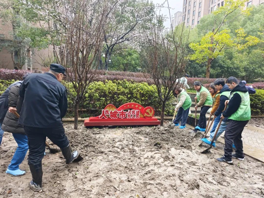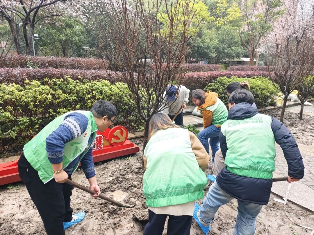 尽管天空飘着蒙蒙细雨,但党员、团员青年志愿者与居民的热情不减。上午9时,尚景园社区的小广场上,党员、团员青年志愿者和社区居民早早集结。简短动员后,大家拿起铁锹、水桶,分组投入到樱花树苗的种植中。挖坑、扶苗、培土、浇水……党员与居民配合默契,雨水与汗水交织,现场一片热火朝天。不到两小时,十株樱花树苗挺拔而立,为社区织就一片“粉色海洋”。