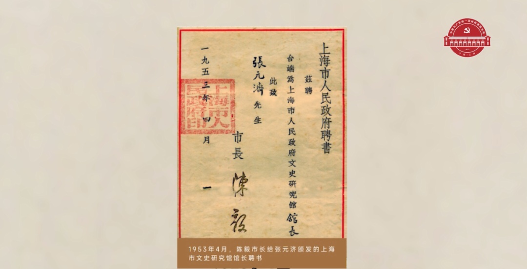 1953年春,陈毅市长两度亲临菊老床前,转述毛泽东主席的原话,上海文史研究馆(首任)馆长非菊老莫属,张元济先生为党中央和毛主席“敬老崇文”的挚诚所感动,最终欣然应允。1953年4月,陈毅签署上海市人民政府聘书,聘请张元济为上海市人民政府文史研究馆馆长。建馆后,张元济先生广泛团结党外知识分子,领导上海文史馆礼聘诸多耆年硕学之士为馆员,把他们团结在爱国统一战线的旗帜下,为社会主义建设服务。