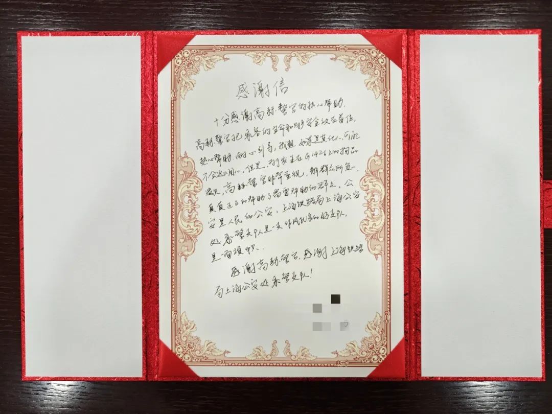 近日,旅客吴先生专程赶到上海铁路公安处乘警支队,向帮助他找回遗失物品的G1427次列车乘警表示感谢,并带来了一面锦旗和手写的感谢信。