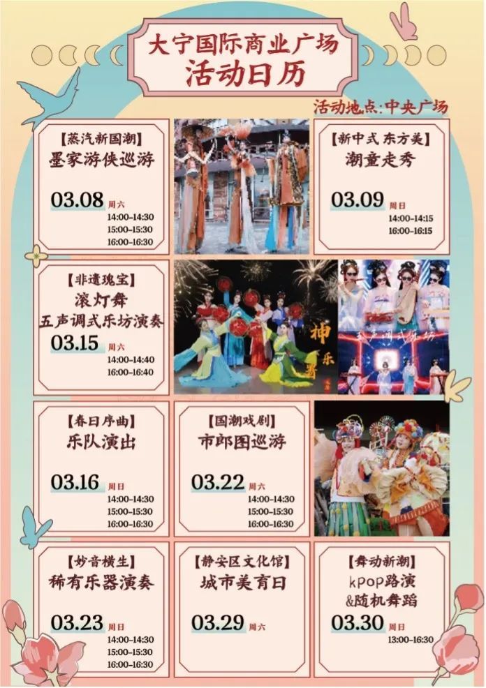 欣赏美丽花海之余,每周末,大宁国际的中央广场还有精彩演出奉上。“非遗”“国潮”“灵动”“江南”......这些关键词将充斥整个3月。