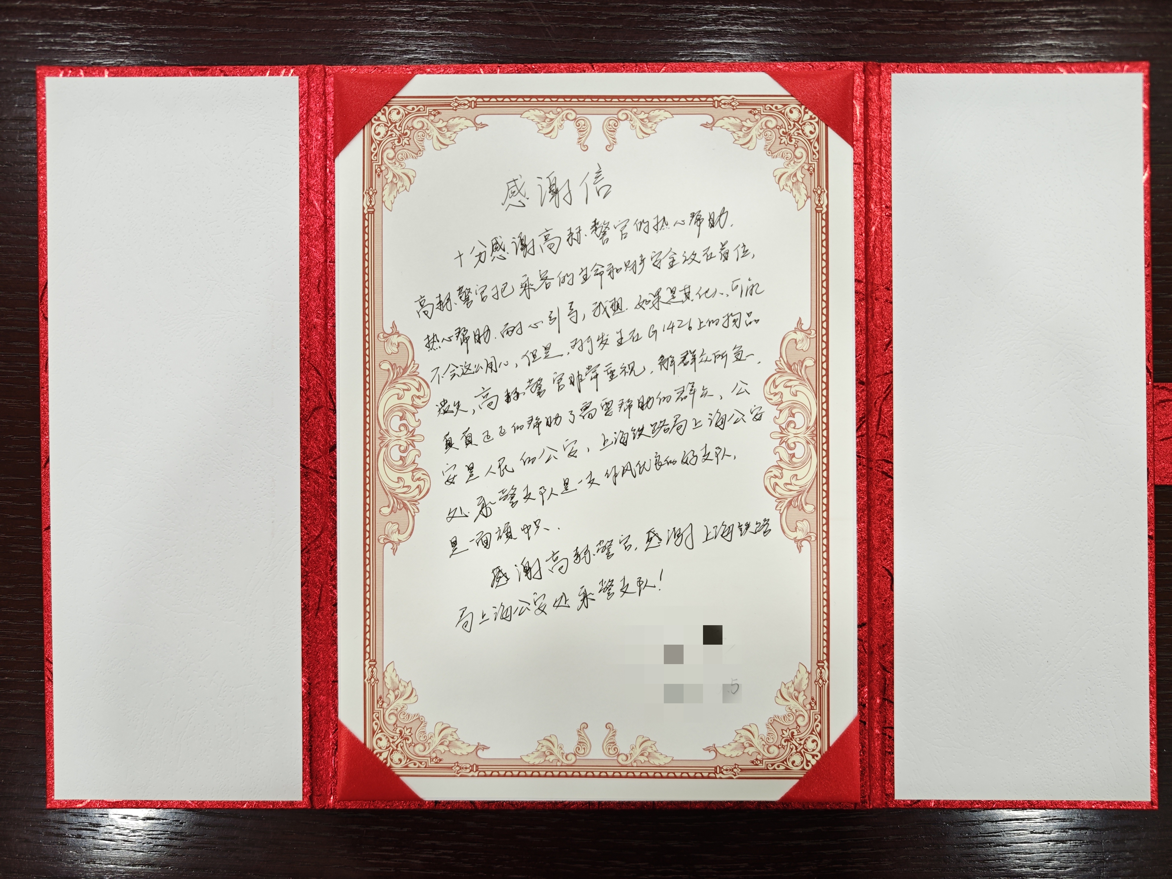 回到上海后,吴先生强烈要求当面向乘警表示感谢,并制作好锦旗和感谢信,于3月11日来到支队亲手交到乘警手中。他激动地说:“一定要当面感谢,为咱们民警的耐心和负责点赞!”