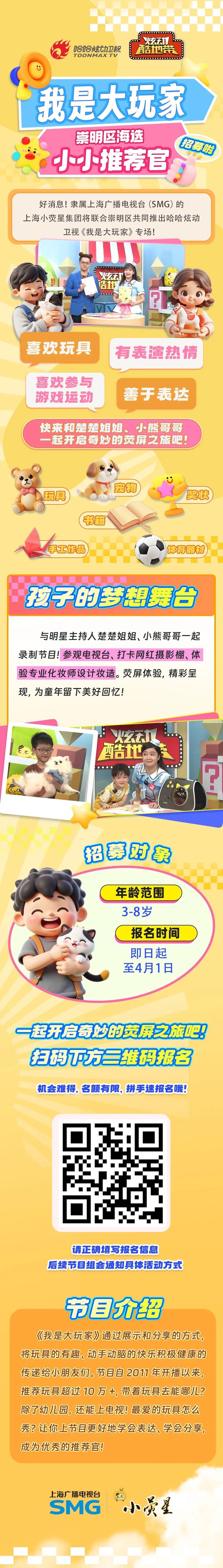 @宝爸宝妈们哈哈炫动卫视《我是大玩家》崇明区海选启动报名啦↓详戳↓来源:上海小荧星集团有限公司编辑:陆海华