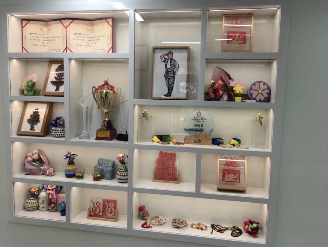 辅楼空间则凸显“赋能”主题,设置残疾人辅具展示区、就业实训基地、远程诊疗室和直播带货区等功能区。残疾人辅具展示区展示了残疾人常用的辅具,例如轮椅、助行器、助视器等,也有对字幕眼镜、智能仿生手等高科技辅具的介绍,可以让残疾人直观地了解和选择合适的辅具。就业实训基地还与街道三个生活盒子里的社区面包房联动,开展咖啡和烘焙制作培训,并提供实习、就业平台。直播带货区域配备专业设备,计划打通残疾人直播带货通道,推动残疾人实现人生价值。中心在公共区域还为残疾人艺术爱好者留下了剪纸作品、户外墙绘等展示空间,让中心成为展现残疾人艺术才华的公共展厅。