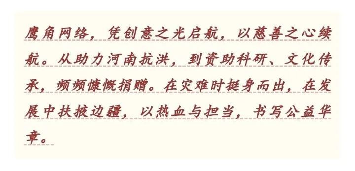 2024年鹰角网络与中国韬奋基金会合作,成立韬奋基金会“文化传承推广”二级专项基金,鹰角注资200万元,将会依托方舟公益计划,在未来开展乡村振兴、教育帮扶及文化传承推广等方面的公益工作,承担社会责任。