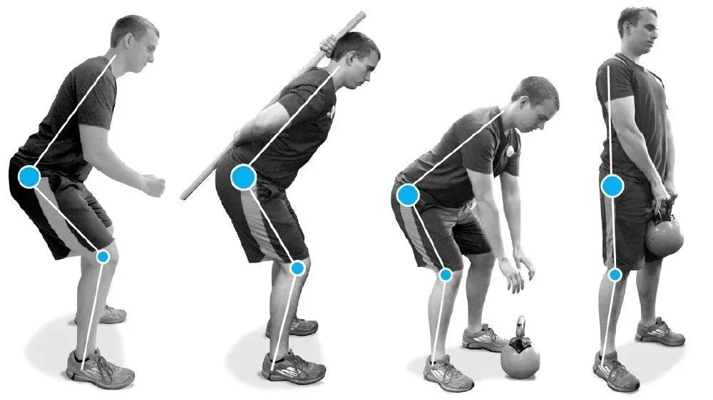 ♦️ 练习正确的屈髋:站姿确认自己的中立位。上半身平直以髋为轴向前折叠,屁股自然地向后移。想象屁股后面有堵墙,用屁股去撞它。注意,在这个过程中膝盖只会轻微向前移动一些,如果向前跑的距离过大,说明髋部的控制和位置出现了问题哦!