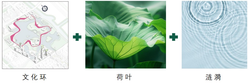 外形以文化环的轮廓形态为主体,结合充满灵动感的荷叶及水波涟漪形态,形成了一个舞动的人的飘逸动作姿态。整体感觉灵动、活泼,中间镂空负形也巧妙地表达了远香湖中间的湖心岛。用一个包边的荷叶形态,表达了和谐、包容的人文理念,也充分体现了嘉定新城远香文化环串珠成链的“环”状空间布局。文化环将承载新城核心区的文化融合功能,助力打造“人文教化地 智慧汽车城”的城市名片。