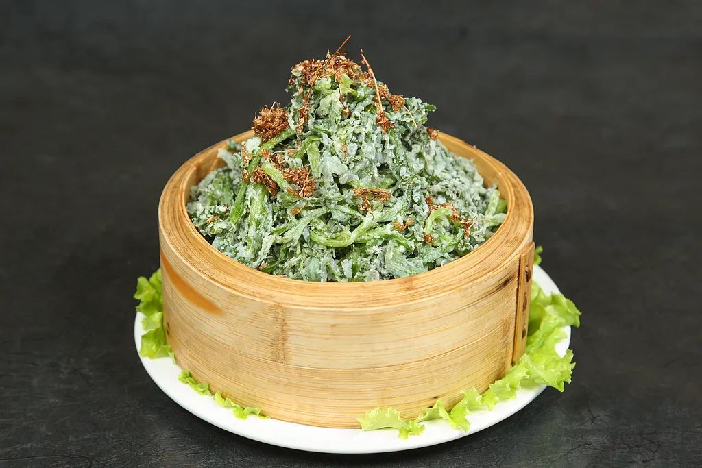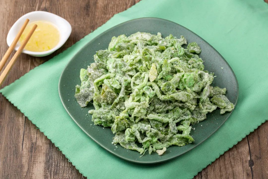 要注意裹粉量的把握。裹粉的量太多,会使蒸好的菜粘在一起,口感不佳;裹粉的量太少,菜叶会直接接触蒸汽,发黄、发软。所以,在裹粉的时候一定要遵循“少量多次”的原则,用翻拌的手法,让菜叶、菜丝均匀地裹上一层薄薄的普通面粉或玉米面粉。