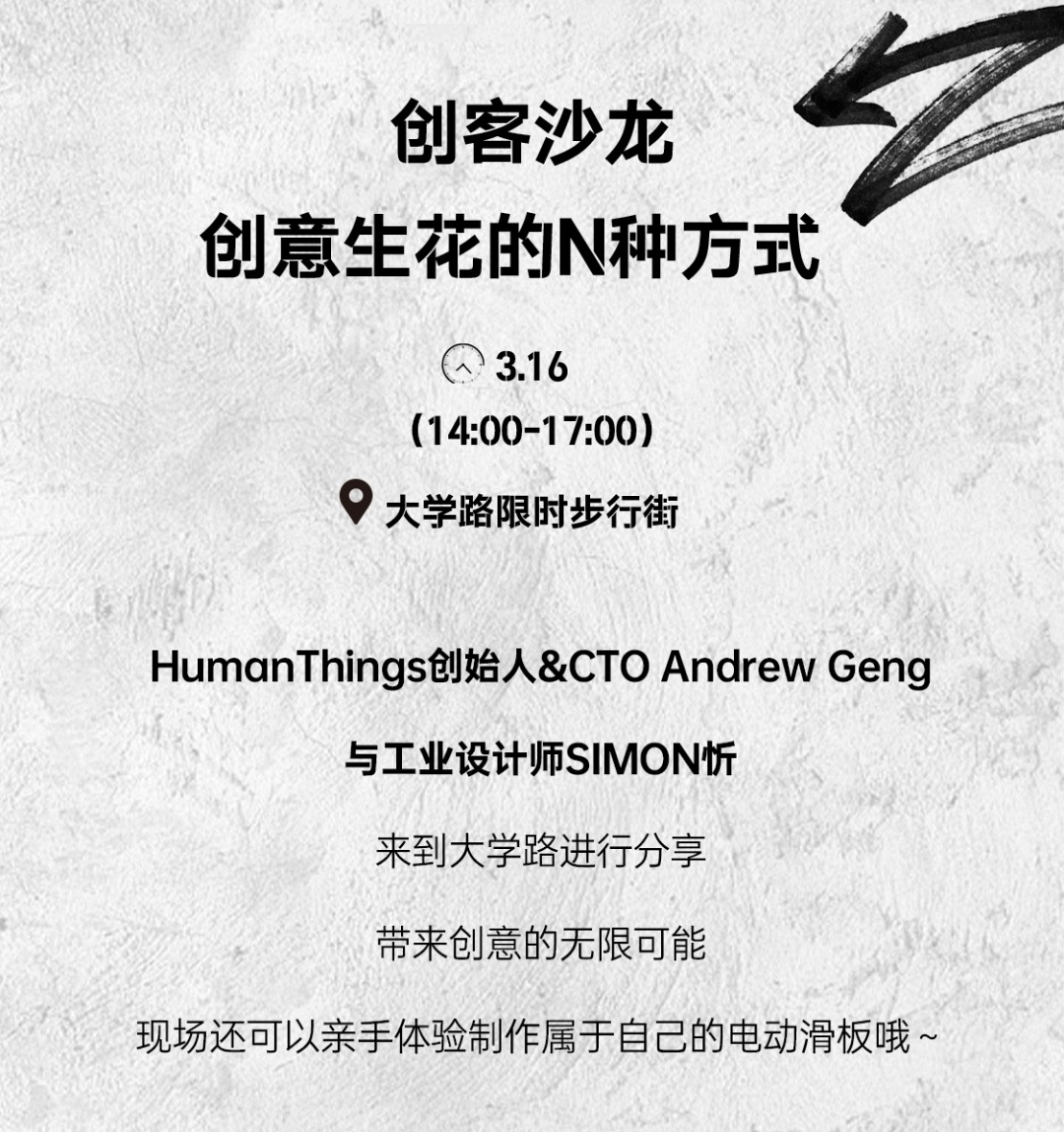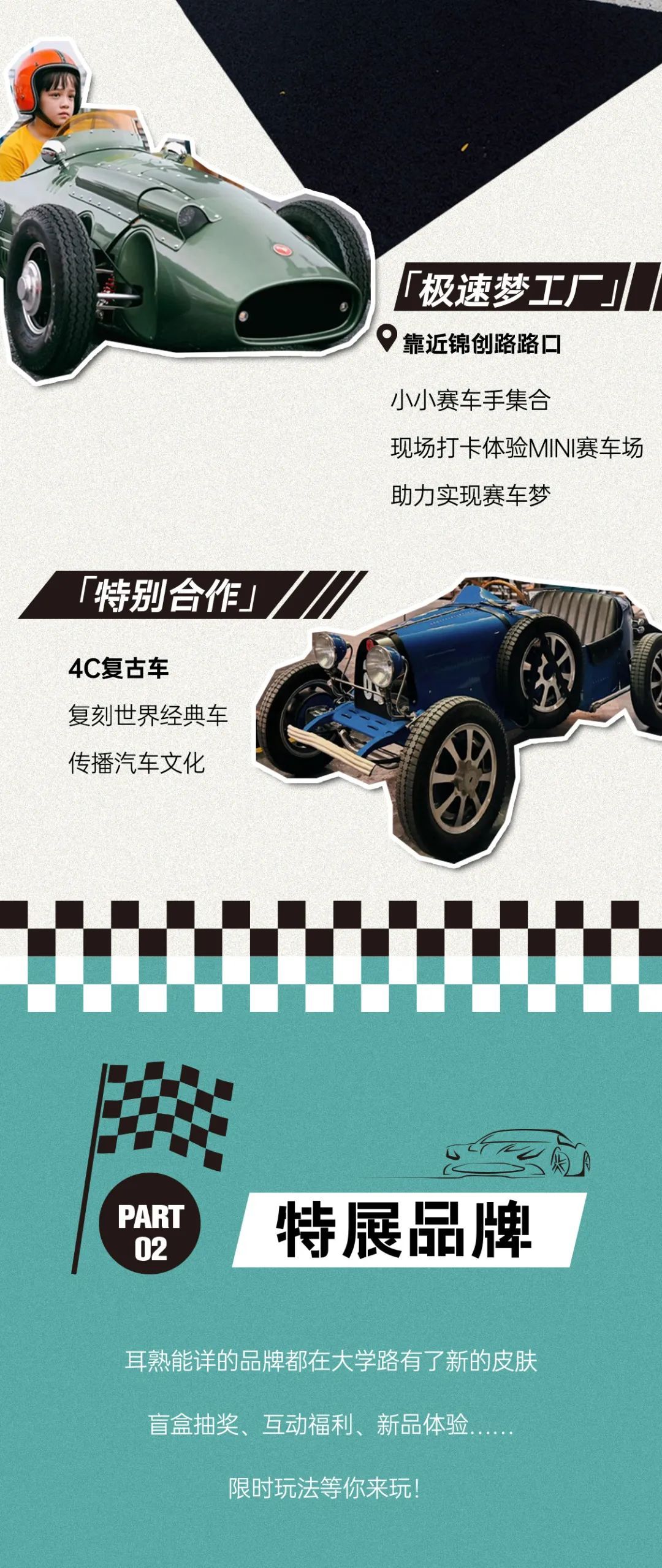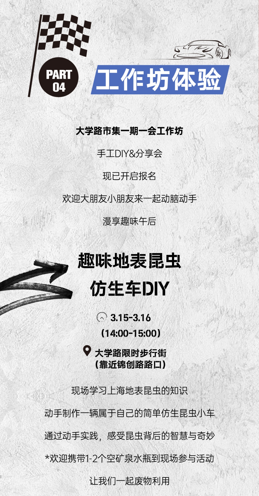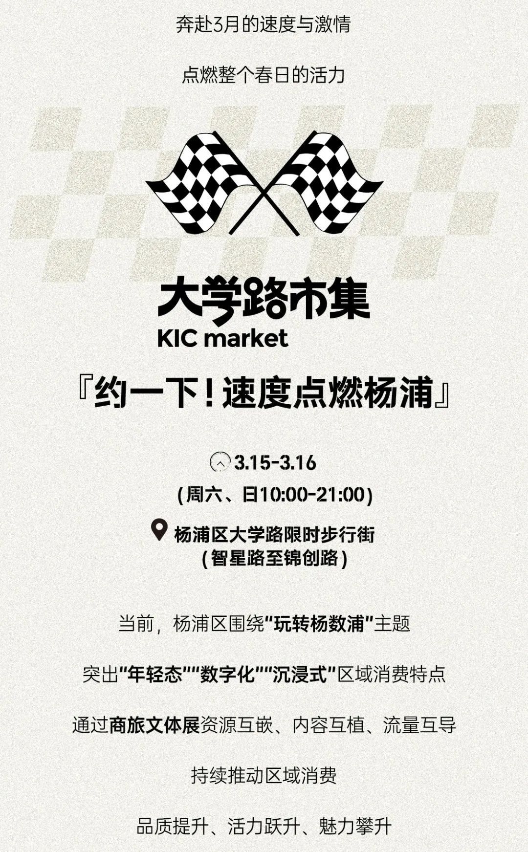 本周末(3月15-16日)相约杨浦大学路限时步行街!本期大学路市集“约一下!速度点燃杨浦” 将带来赛车元素主题展览、品牌摊位、工作坊体验等精彩活动我们不见不散哦
