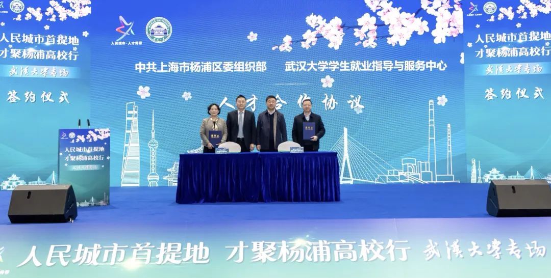 在屈文谦、周嵘的共同见证下,杨浦区委组织部与武汉大学学生就业指导与服务中心共同签订人才合作协议。