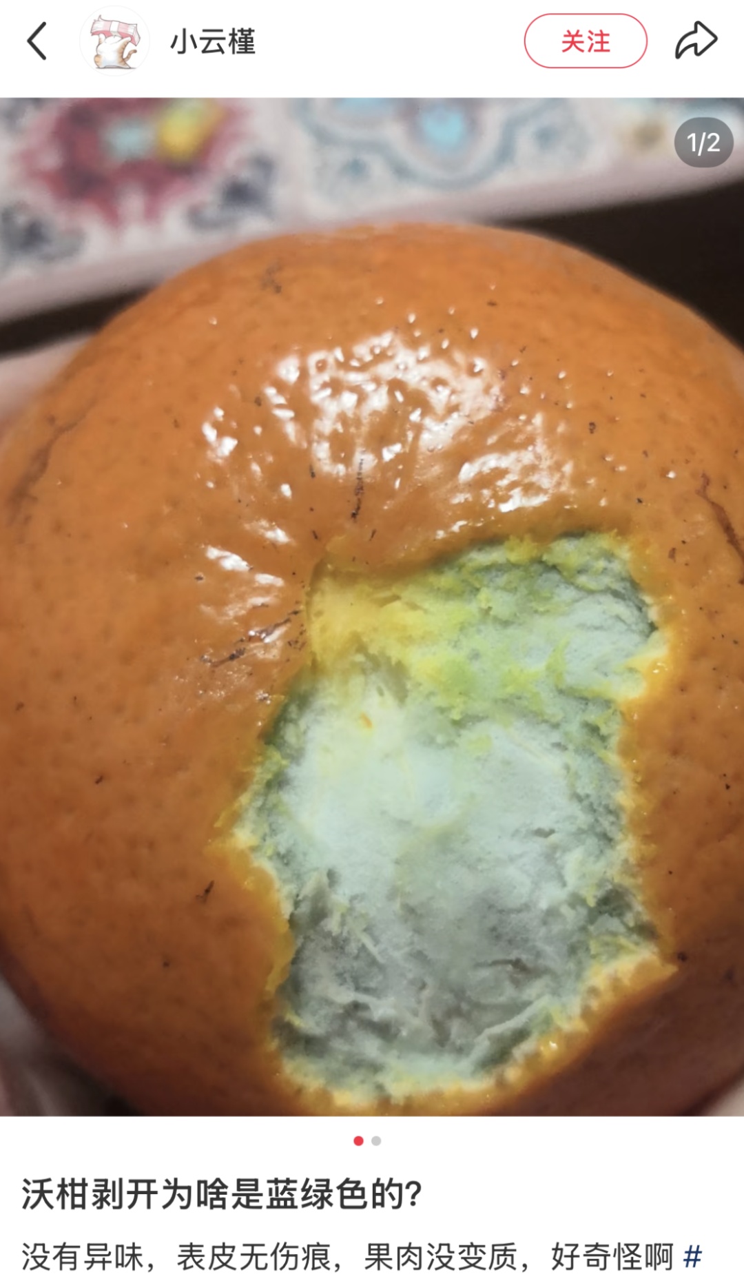 如果沃柑果皮内侧的蓝色比较浅,而且看起来比较均匀,用湿纸巾轻轻擦拭蓝色的部位也可以比较容易地去除,那很可能就是花青素或者铜离子氧化。这种情况下,果肉一般是安全的。