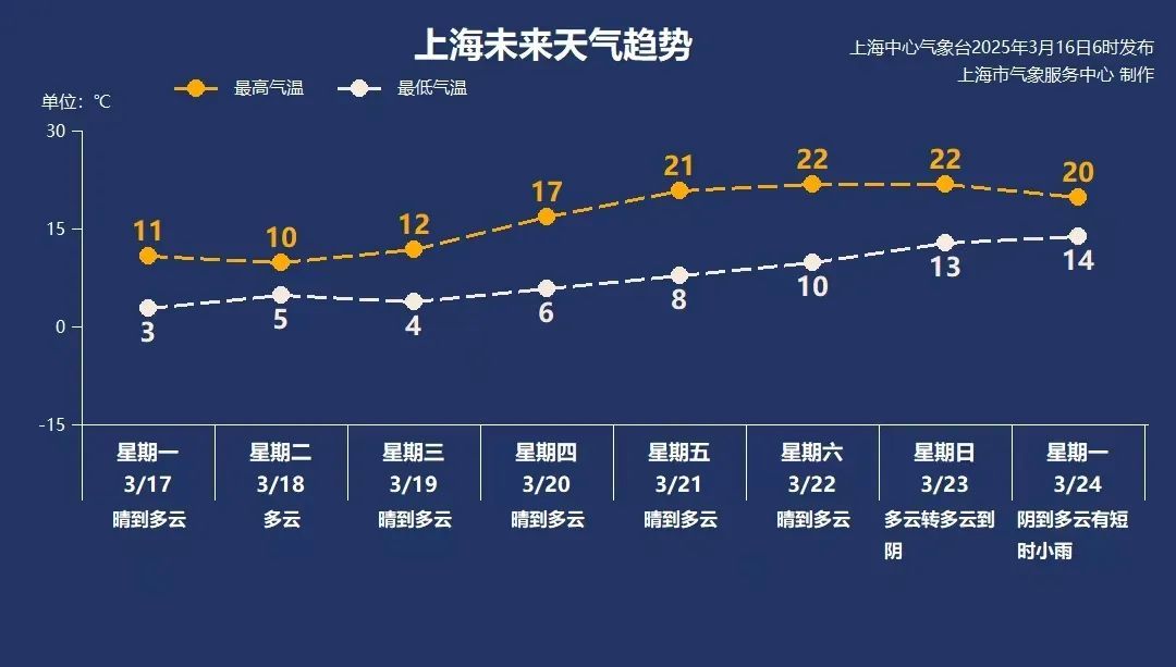 上海中心气象台预计,明天早上气温将来到近期的最低点,市区最低气温3℃左右,郊区零下1℃到1℃,局部地区有薄冰,周一早上出行保暖措施要做好。不过在冷空气影响下,下周天空放晴,洗晒工作可以安排起来。下周三起,本市风力逐渐减小,气温步入回升态势。到下周后期最高气温重新回到“2”字头,春暖花开的天气就要来了。未来升温虽明显,但昼夜温差也将拉大,穿衣需灵活。