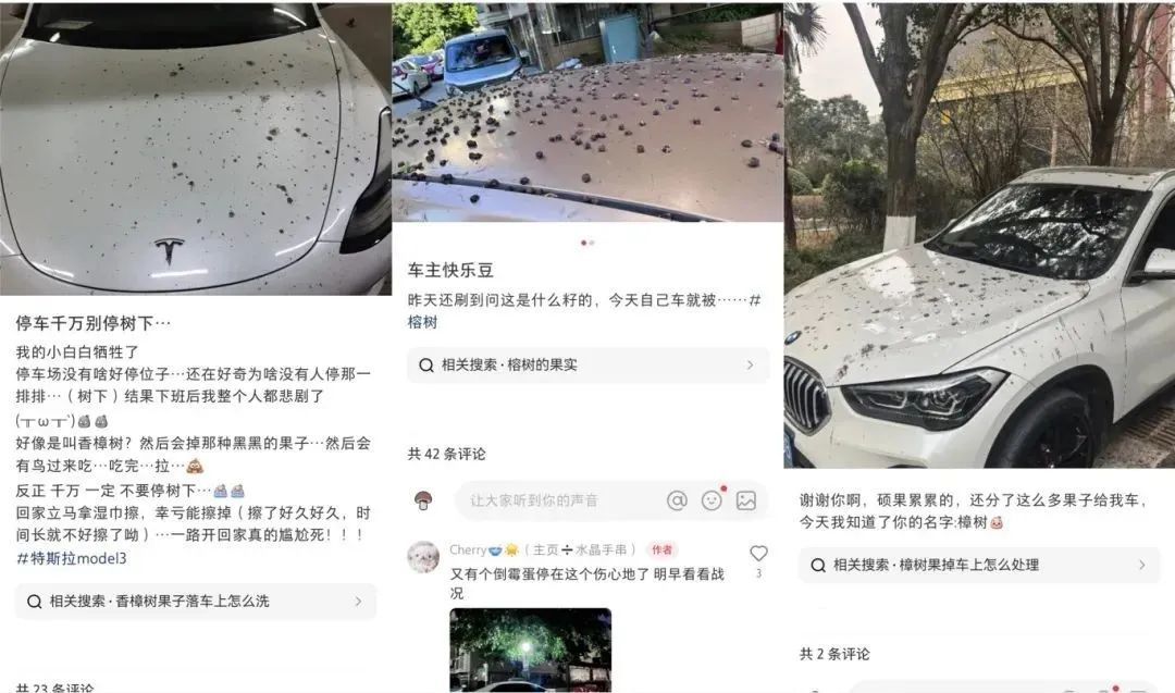 停车时要注意,尽量避开香樟树。樟树籽汁液是弱酸性物质,长时间不去除,将腐蚀车辆表面油漆。如车上有樟树籽果浆,须及时清理。