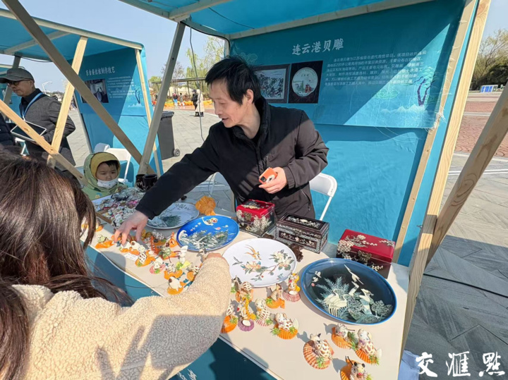 连云港贝雕展位前,五彩斑斓的贝壳经过连云港贝雕传承人张西月巧手雕琢,化身为憨态可掬的小猫、灵动活泼的小兔等萌趣十足的工艺品,引得众多小朋友驻足围观。“我们连云港人爱吃贝类,剩下的贝壳原本是废物,现在可以利用起来制作贝雕作品。”张西月介绍说,贝雕以有色贝壳为原料,经过剪取、车磨、抛光、堆砌、粘贴等工序精心雕琢而成,“贝壳的种类不同,其构造,质地,色彩等区别都很大。我们需要根据画面设计的要求,去选择相对应的贝壳来进行雕刻。在选材过程中会注意尽量采用自然色的贝壳,这样做出来的贝雕画才感觉完美。”