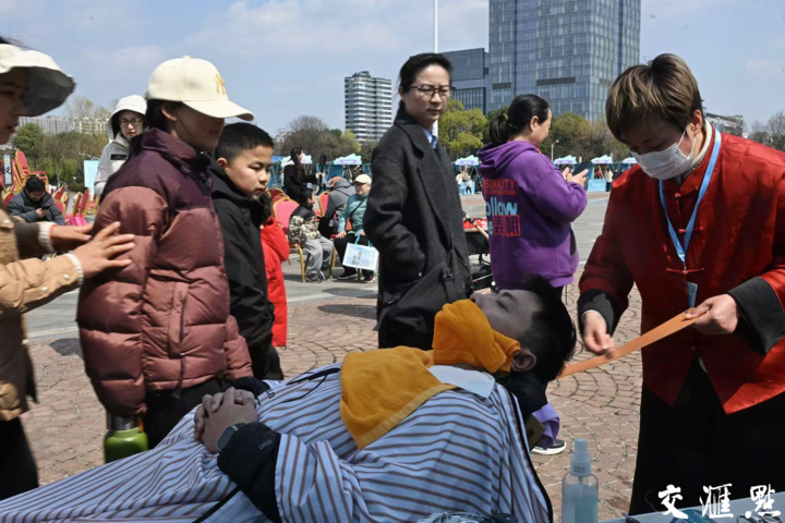 “扬州三把刀果然名不虚传!”行云流水、一气呵成,现场享受了“扬州三把刀”之一剃头刀的手艺之后,市民张先生顿感神清气爽、轻松舒坦。现场,扬州理发展位前排起了长队,扬州紫罗兰美发店的高级美发技师,扬州理发技艺第四代传承人鲍玉贞忙而不乱,手中的剃刀在顾客面颊上轻盈游走。“老扬州修面,讲究‘七十二刀半’,完整刮一张脸,需要七十二刀,最后半刀是刮一下鼻梁上的汗毛。”鲍玉贞说,尽管现代新式剃须工具层出不穷,但老刀修面凭借独特的仪式感与舒适体验,仍然在扬州城市街巷的老理发店内得以保留,不仅老一辈人钟情于这份传统技艺,许多年轻人也纷纷走进老理发店,体验这份独特的惬意。