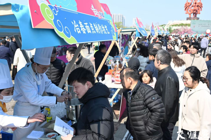 南京绒花、惠山泥人、徐州香包等摊位依次排开,琳琅满目的非遗好物,吸引众多市民不停“买买买”;另一边,平桥豆腐、天目湖砂锅鱼头、黄桥烧饼等非遗美食更是香气四溢,令人食指大动……