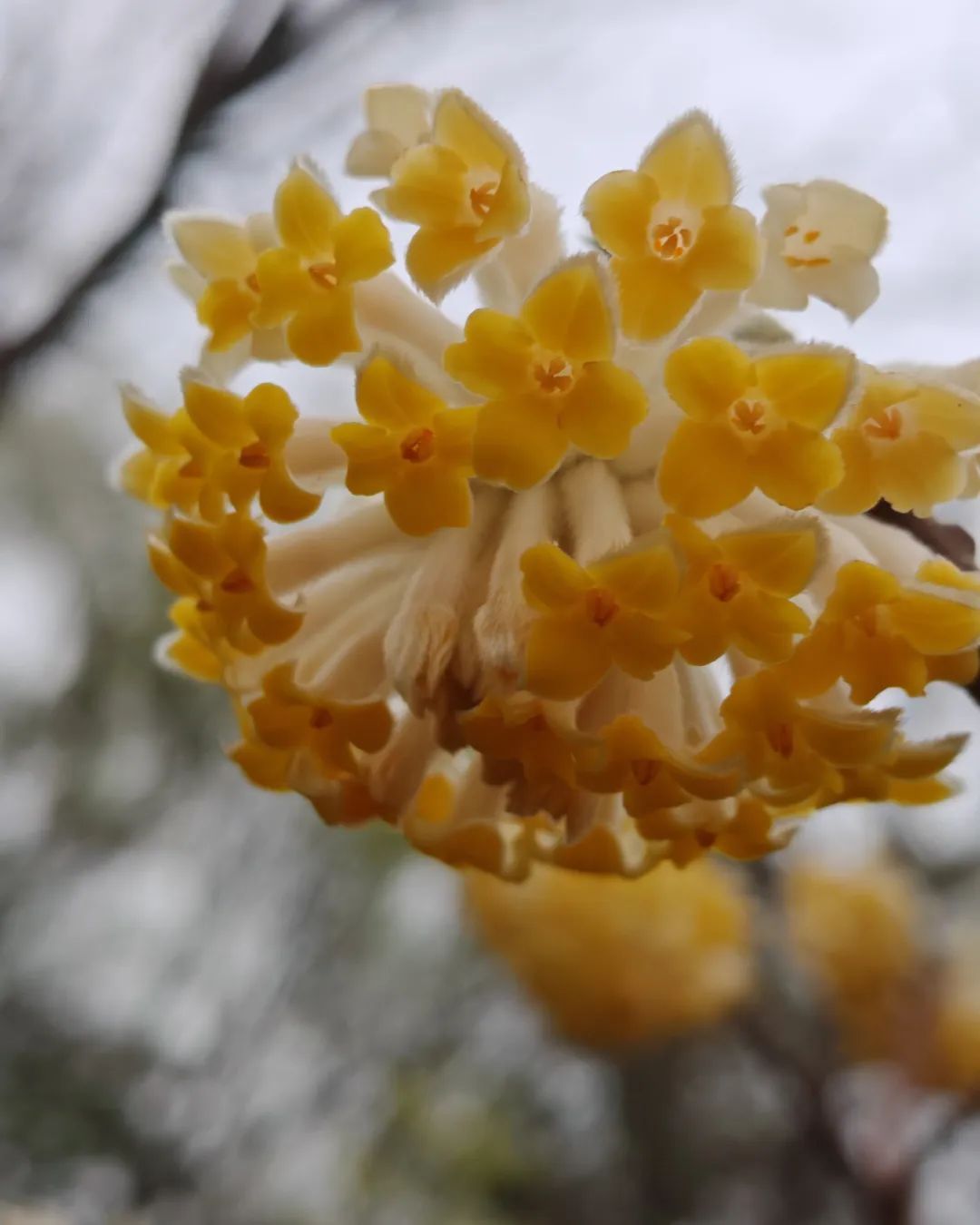一朵结香花大小如同婴儿拳头,是由十几根管状花组成的头状花序。组成花球的小花拥有四朵金黄色的“花瓣”,但其实这四瓣并不是花瓣,而是花萼。它们真正的花瓣已经消失不见了,这也是结香所在的瑞香科植物的一个重要特征。