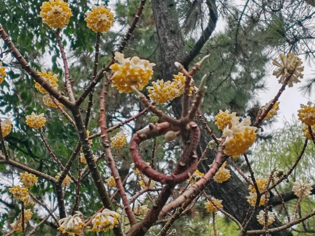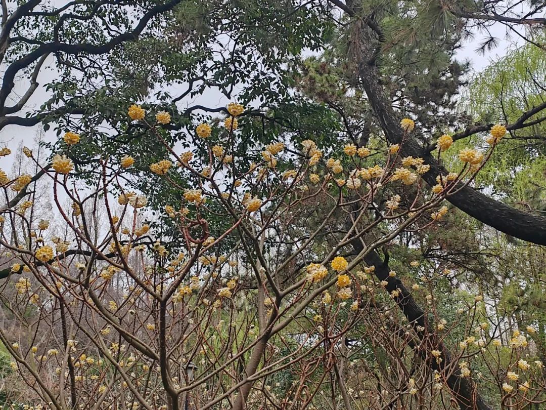 结香枝桠顶端结出一朵朵圆滚滚、金灿灿的绒球,团成一团吐露着芳香。中山公园里,数十棵结香共同绽放,在绿树丛中绽放成惹人注目的金黄花田。