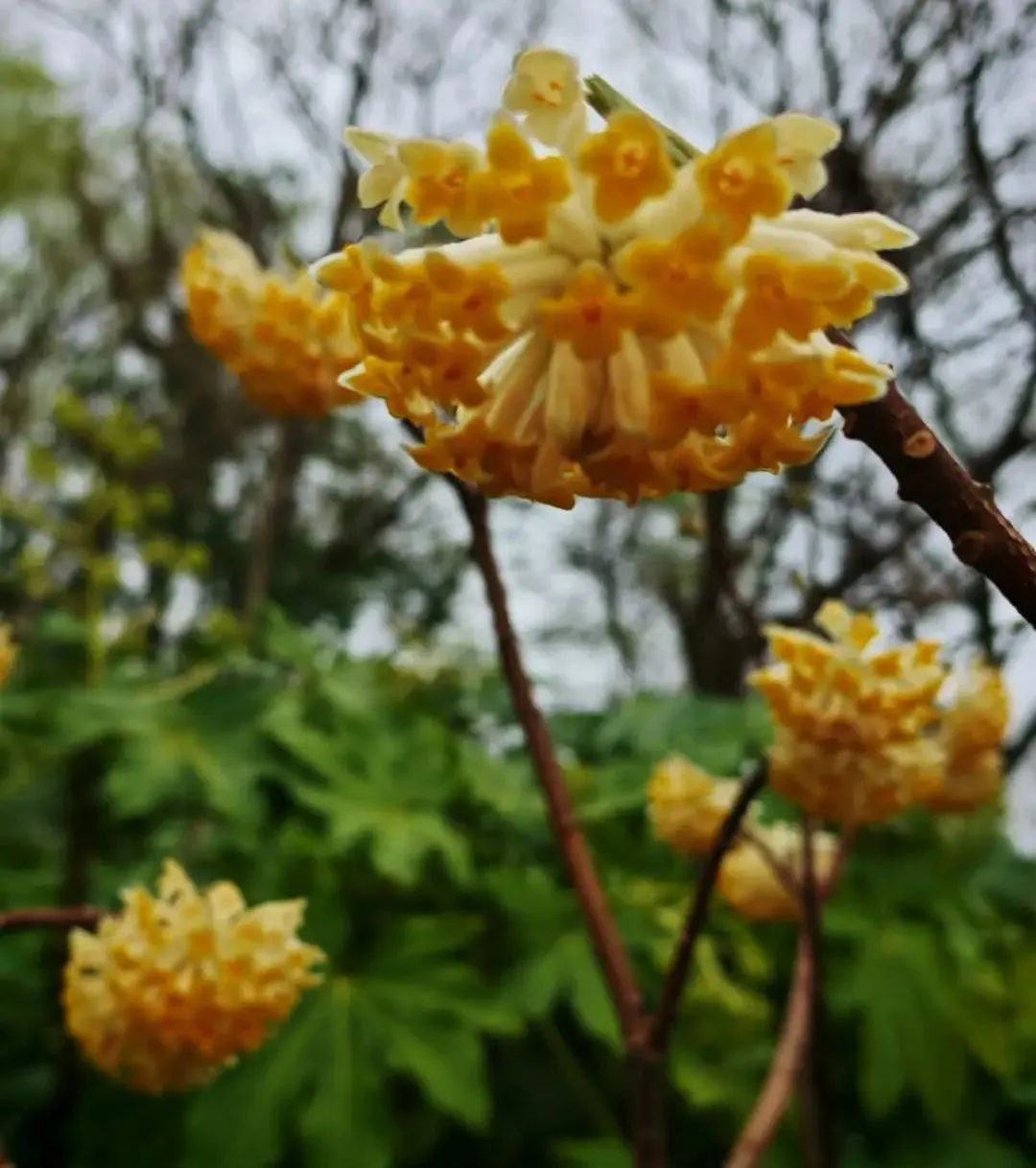 结香是一种落叶灌木,具有先花后叶的特征。结香的小枝较为粗壮,常3叉分枝。枝干呈棕红或褐色,并且茎皮极为强韧柔软,可以“打结”。弯曲的枝干在生长的过程中,也会逐渐弯折缠绕,因此得名“结香”。